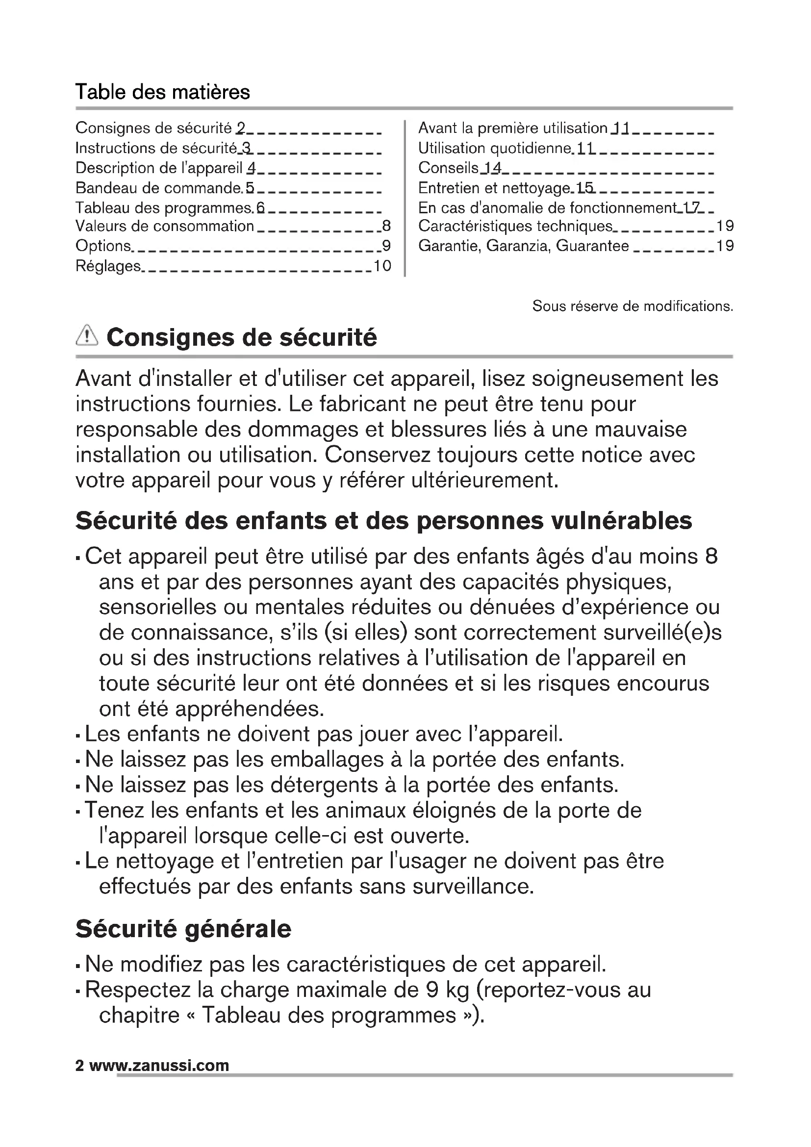 ZWF1230 ZWF1430 Lave-linge LavabiancheriaTable des matières Consignes de sécurité 2 Instructions de sécurité 3 Description de l'appareil 4 Bandeau de commande 5 Tableau des programmes 6 Valeurs de consommation
