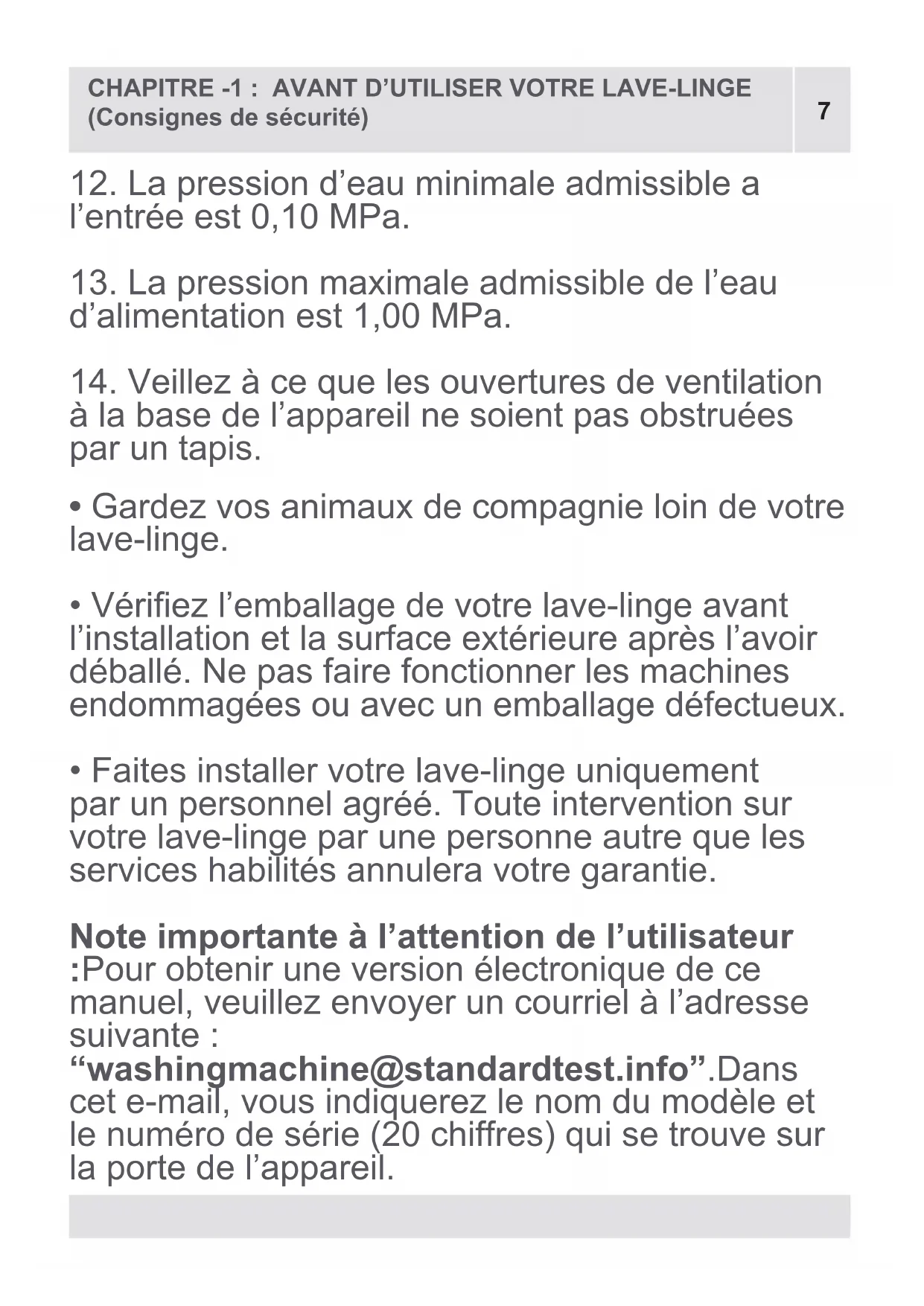 Pourobteniruneversionélectroniquedece manuel,veuillezenvoyeruncourrielàl’adresse suivante: “washingmachine@standardtest.info”.Dans cete-mail,vousindiquerezlenomdumodèleet lenumérodesérie(20chiffres)quisetrouvesur laportedel’appareil. CHAPITRE -1 : AVANT D’UTILISER VOTRE LAVE-LINGE (Consignes de sécurité)8 CHAPITRE -1 : AVANT D’UTILISER VOTRE LAVE-LINGE (Consignes de sécurité)