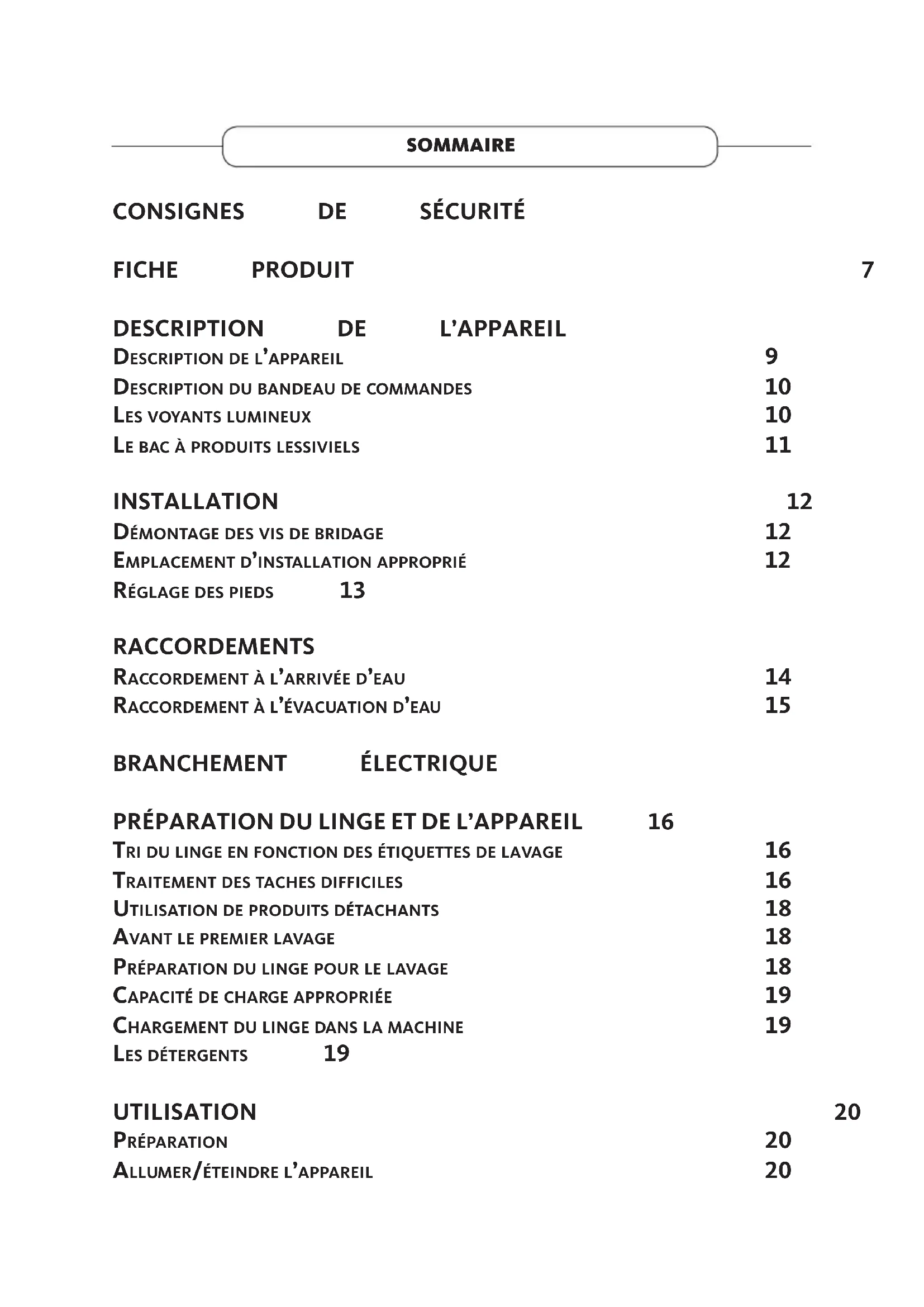 Description De l’appareil 9 Description Du banDeau De commanDes 10 les voyants lumineux 10 le bac à proDuits lessiviels 11 INSTALLATION 12 Démontage Des vis De briDage 12 emplacement D’installation approprié 12 réglage Des pieDs 13 RACCORDEMENTS 14 raccorDement à l’arrivée D’eau 14 raccorDement à l’évacuation D’eau 15 BRANCHEMENT ÉLECTRIQUE 15 PRÉPARATION DU LINGE ET DE L’APPAREIL 16 tri Du linge en fonction Des étiquettes De lavage 16 traitement Des taches Difficiles 16 utilisation De proDuits Détachants 18 avant le premier lavage 18 préparation Du linge pour le lavage 18 capacité De charge appropriée 19 chargement Du linge Dans la machine 19 les Détergents 19 UTILISATION 20 préparation 20 allumer/éteinDre l’appareil 20lancement D’un programme 20 tableau Des programmes 21 moDifier un programme en cours 24 annuler un programme en cours 24 programmer un Départ Différé 24 sécurité enfant (verrouillage Des touches) 24 fin Du programme 25