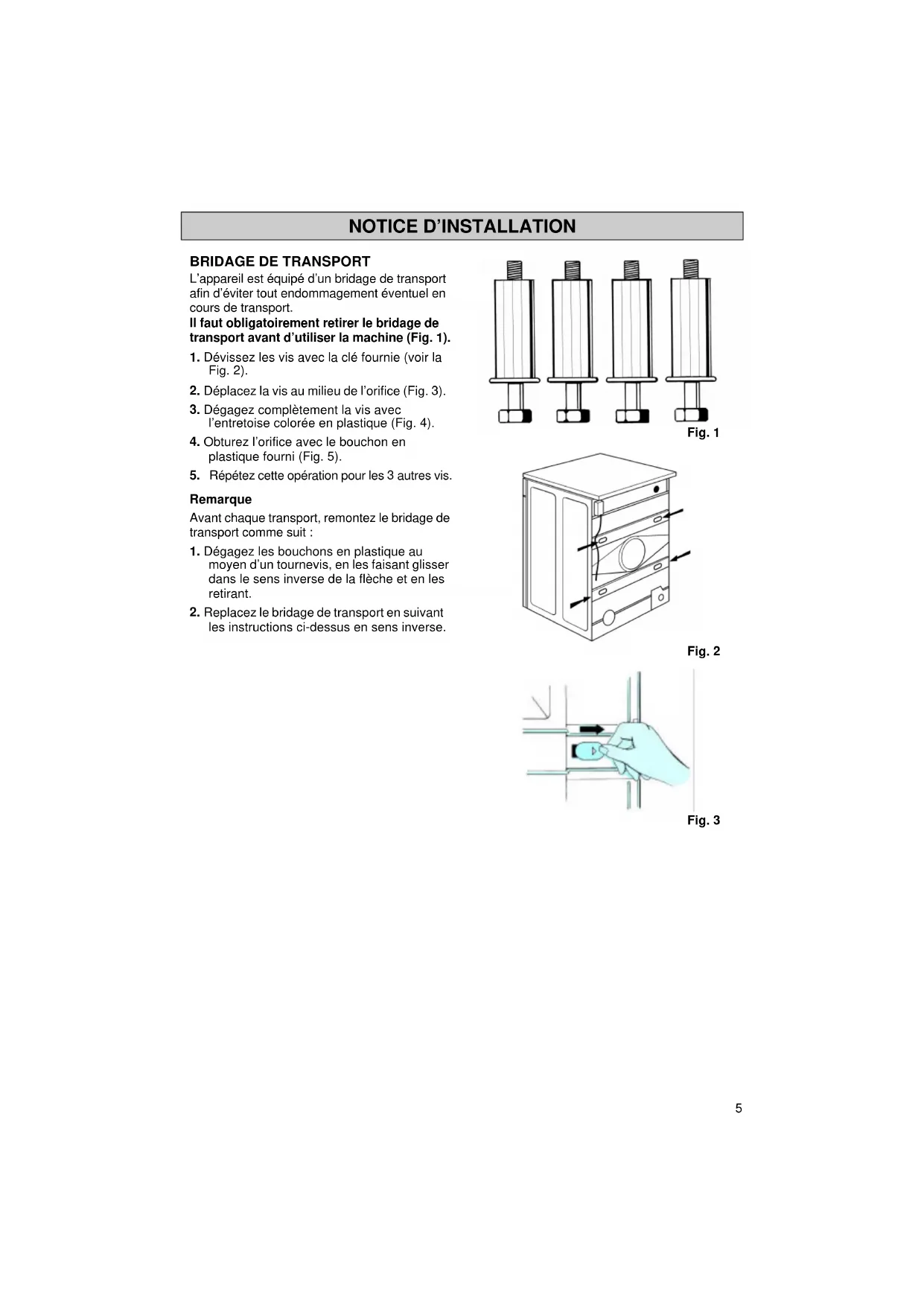L’appareil est équipé d’un bridage de transport afin d’éviter tout endommagement éventuel en cours de transport. Il faut obligatoirement retirer le bridage de transport avant d’utiliser la machine (Fig. 1).