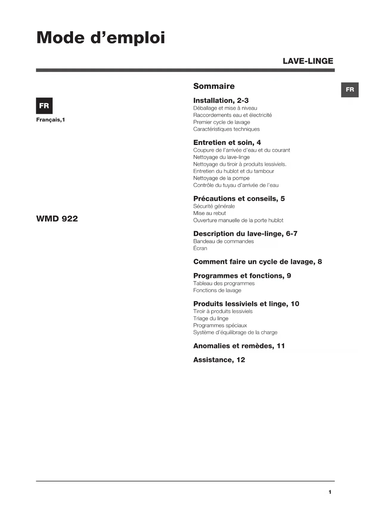 Français,1 Sommaire Installation, 2-3 Déballage et mise à niveau Raccordements eau et électricité Premier cycle de lavage Caractéristiques techniques Entretien et soin, 4 Coupure de l’arrivée d’eau et du courant Nettoyage du lave-linge Nettoyage du tiroir à produits lessiviels. Entretien du hublot et du tambour Nettoyage de la pompe Contrôle du tuyau d’arrivée de l’eau Précautions et conseils, 5 Sécurité générale Mise au rebut Ouverture manuelle de la porte hublot Description du lave-linge, 6-7 Bandeau de commandes Écran Comment faire un cycle de lavage, 8 Programmes et fonctions, 9 Tableau des programmes Fonctions de lavage Produits lessiviels et linge, 10 Tiroir à produits lessiviels Triage du linge Programmes spéciaux Système d’équilibrage de la charge Anomalies et remèdes, 11 Assistance, 12