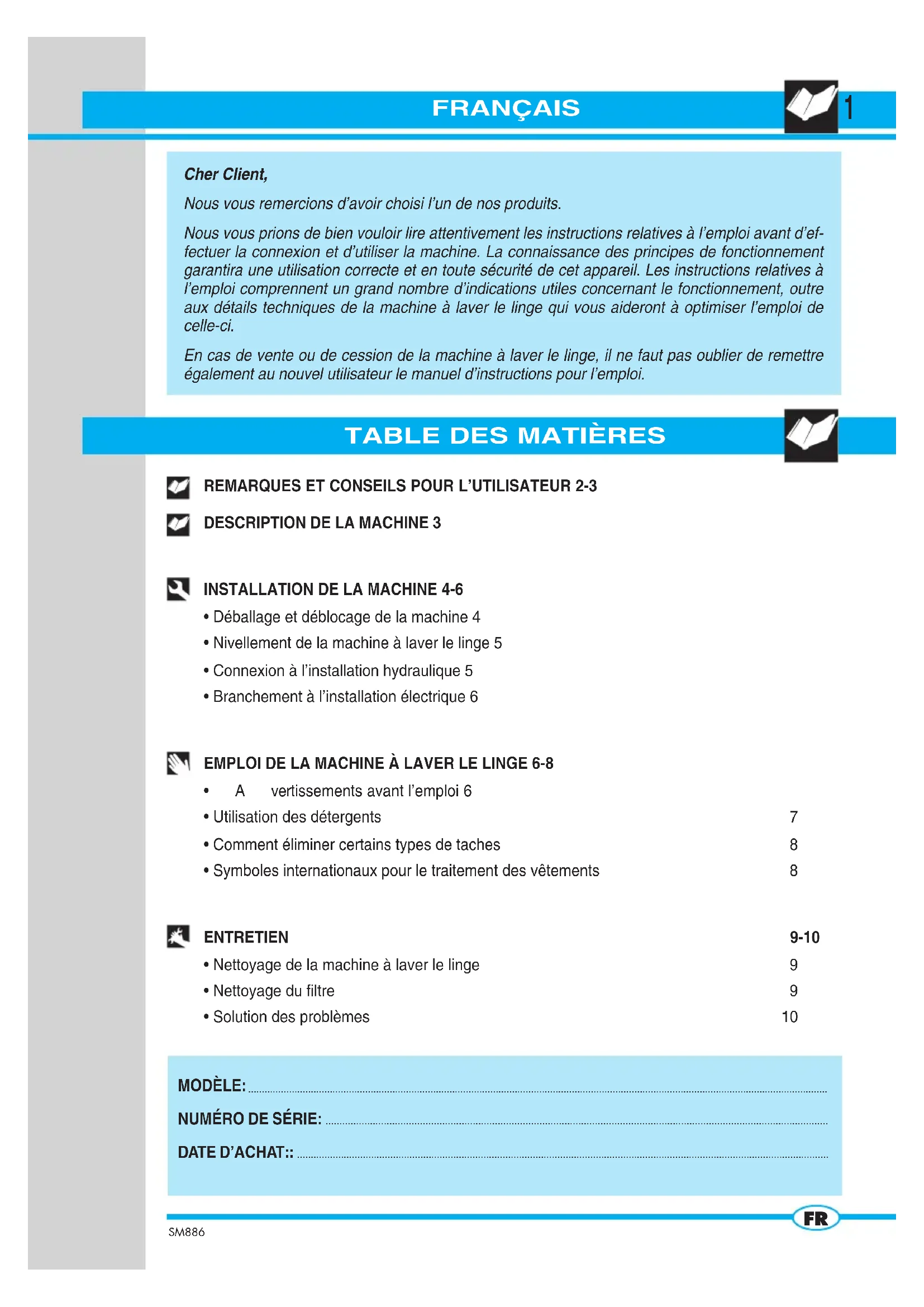 veiller à ce que dans les poches des vêtements il n’y ait aucun objet suscep- tible d’endommager le linge, la machine ou le filtre. SM886 Imp 12-02-2004, 10:536SM886