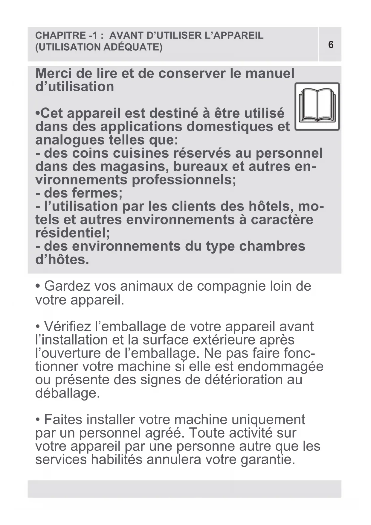 - Faitesinstallervotremachineuniquement parunpersonnelagréé.Touteactivitésur votreappareilparunepersonneautrequeles serviceshabilitésannuleravotregarantie.7 CHAPITRE -1 : AVANT D’UTILISER L’APPAREIL (UTILISATION ADÉQUATE)