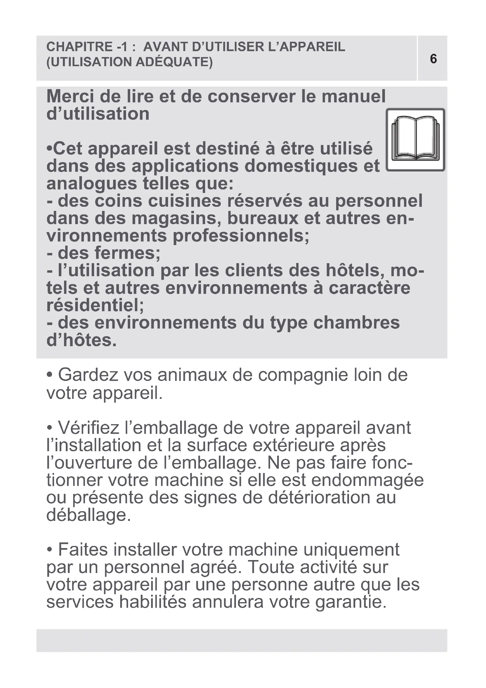 - Vérifiez l'emballage de votre apparéil avant l'installation et la surface extérieure après l'ouverture de l'emballage. Ne pas faire fonctionner votre machine si elle est endommagée ou présente des signes de détérioration au déballage.