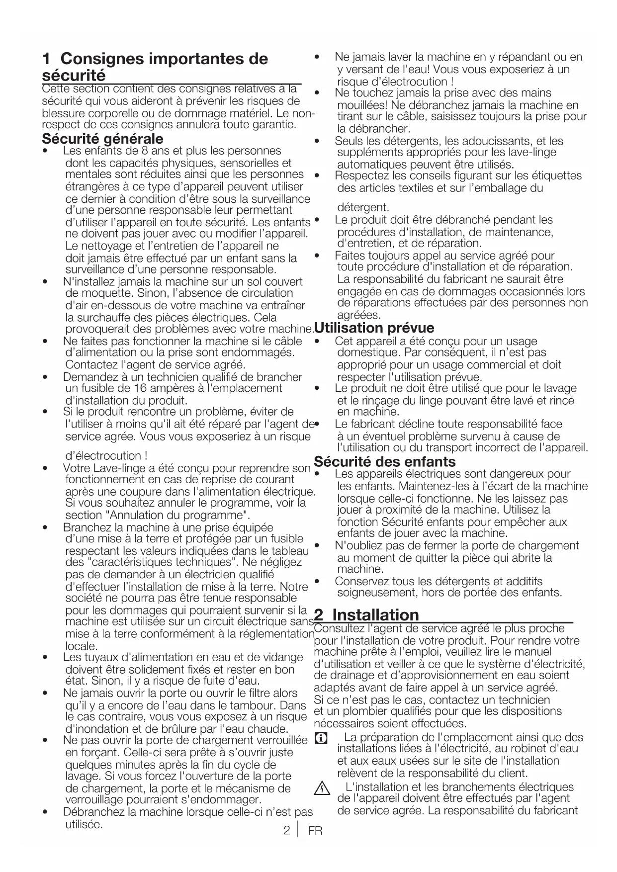 Assurez-vousquelesraccordements d’eaufroideetd’eauchaudesonteffectués correctement lors de l’installation de votre machine. Sinon, votre linge pourrait être chaud enfindelavageets’user.