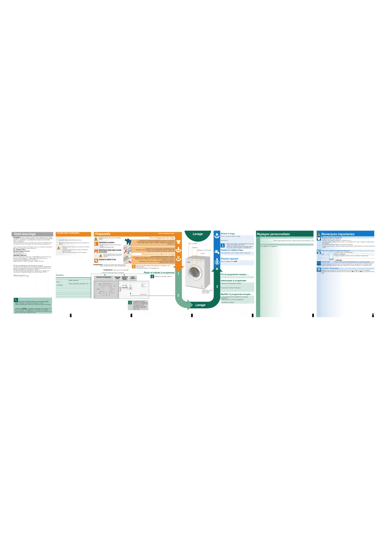 Consignes de sécurité – Veuillez lire et vous conformer à la notice d'installation et d'utilisation ainsi qu'à toutes les autres informations fournies avec votre lave-linge.– Conservez ces documents pour toute utilisation ultérieure. Risque d'électrocution – Débranchez toujours la machine en tenant la fiche, ne tirez jamais directement sur le cordon d'alimentation.– Ne branchez / débranchez jamais la machine avec les mains humides.Danger de mort Lorsque la machine ne sert plus :– Débranchez la fiche de la prise de courant.– Sectionnez le cordon d'alimentation pour le rendre inutilisable.– Détruisez le système de fermeture du hublot. Les enfants ne risqueront pas de s'enfermer et de mettre leur vie en danger. Risque d'asphyxie – Tenez les emballages, les plastiques et divers éléments des emballages hors de la portée des enfants. Risque d'empoisonnement – Rangez la lessive et les additifs hors de portée des enfants. Risque d'explosion – Les articles textile préalablement traités avec des produits nettoyants à base de solvants, du type détachants, benzine, peuvent provoquer une explosion une fois chargés dans le tambour.Rincer abondamment à la main les articles avant de les charger.Risque de blessures – Le hublot peut devenir très chaud.– Faites attention lorsque vous vidangez le bain lessiviel chaud.– Ne montez jamais sur le lave-linge.– Ne vous appuyez jamais sur le hublot ouvert.– Ne saisissez pas le tambour s'il tourne encore.– Faites attention lorsque vous ouvrez le bac à produits en cours de fonctionnement. Valeurs de consommation Programme Charge Électricité** Eau** Durée du programme** v](blanc/couleurs) 30 °C * 5 kg 0.31 kWh 54 l 100 min v](blanc/couleurs) 40 °C * 5 kg 0.55 kWh 54 l 100 min v](blanc/couleurs) 60 °C* 5 kg 0.80 kWh 54 l 115 min v](blanc/couleurs) 60 °C taches* 5 kg 0.85 kWh 41 l 175 min v](blanc/couleurs) 90 °C 5 kg 1.90 kWh 61 l 110 min ` (synthétiques) 40 °C* 2.5 kg 0.45 kWh 50 l 75 min d (délicat )30 °C 2 kg 0.30 kWh 55 l 50 min q (laine) 30 °C 2 kg 0.20 kWh 35 l 55 min
