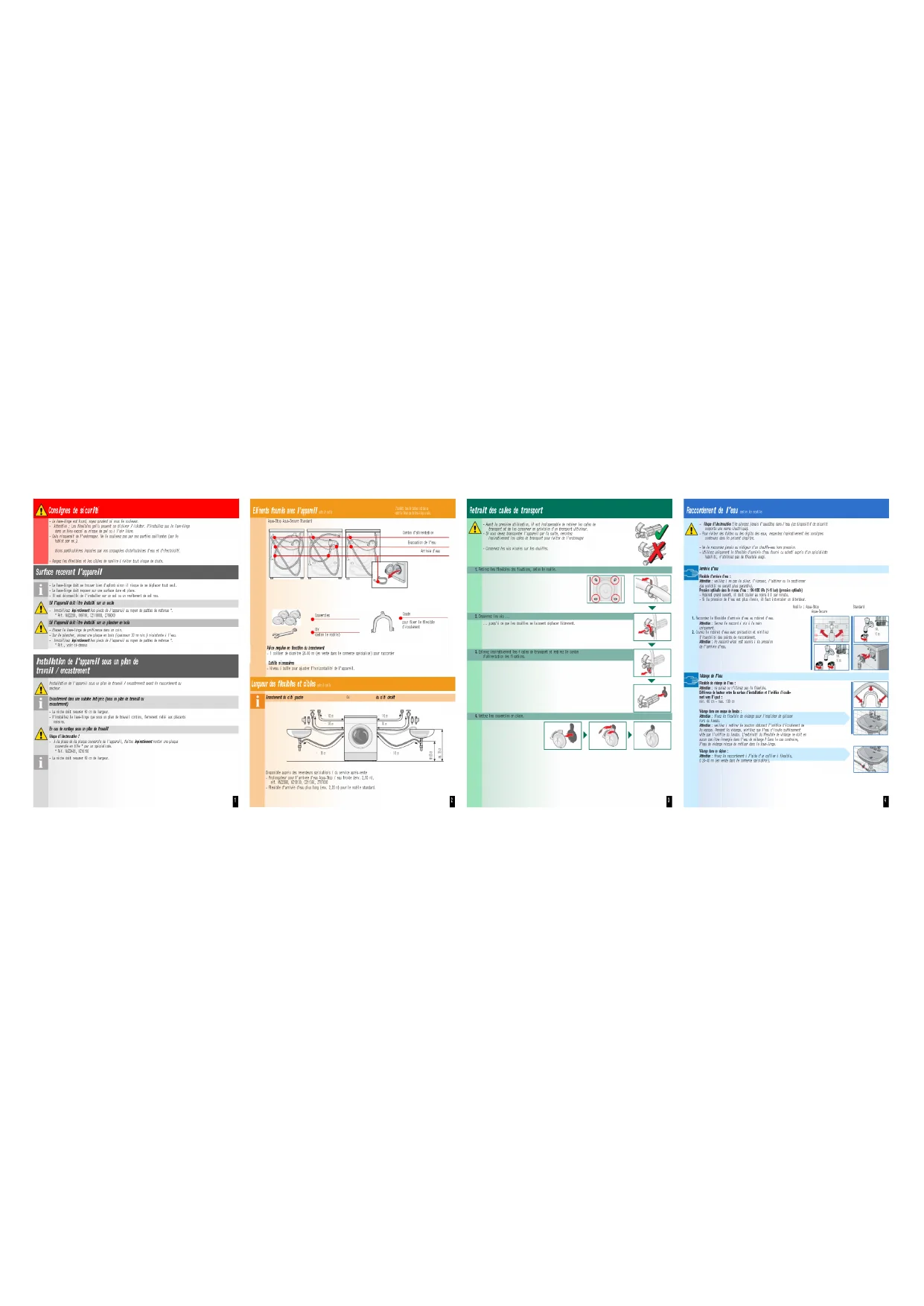 - ʋGarantie aquaStop Notice d'installation Ne mettez ce lave-linge en service qu'après avoir lu la présente notice.Veuillez également tenir compte de la notice d'utilisation.Conservez soigneusement ces notices. Elles pourront vous être utiles par la suite ou servir à un autre utilisateur. fr1 Consignes de sécurité Le lave-linge est lourd, soyez prudent si vous le soulevez. Attention : Les flexibles gelés peuvent se déchirer / éclater. N'installez pas le lave-linge dans un lieu exposé au risque de gel ou à l'air libre. Cela risquerait de l'endommager. Ne le soulevez pas par ses parties saillantes (par le hublot par ex.). Outre les consignes énoncées ici, vous aurez peutäêtre à respecter certaines prescrip- tions particulières imposées par vos compagnies distributrices d'eau et d'électricité. En cas de doute, confiez le raccordement de votre laveälinge à un spécialiste. Rangez les flexibles et les câbles de manière à éviter tout risque de chute. Surface recevant l'appareil Le lave-linge doit se trouver bien d'aplomb sinon il risque de se déplacer tout seul. Le lave-linge doit reposer sur une surface dure et plane. Il est déconseillé de l'installer sur un sol ou un revêtement de sol mou. Si l'appareil doit être installé sur un socle Immobilisez impérativement les pieds de l'appareil au moyen de pattes de retenue *. p. 7
