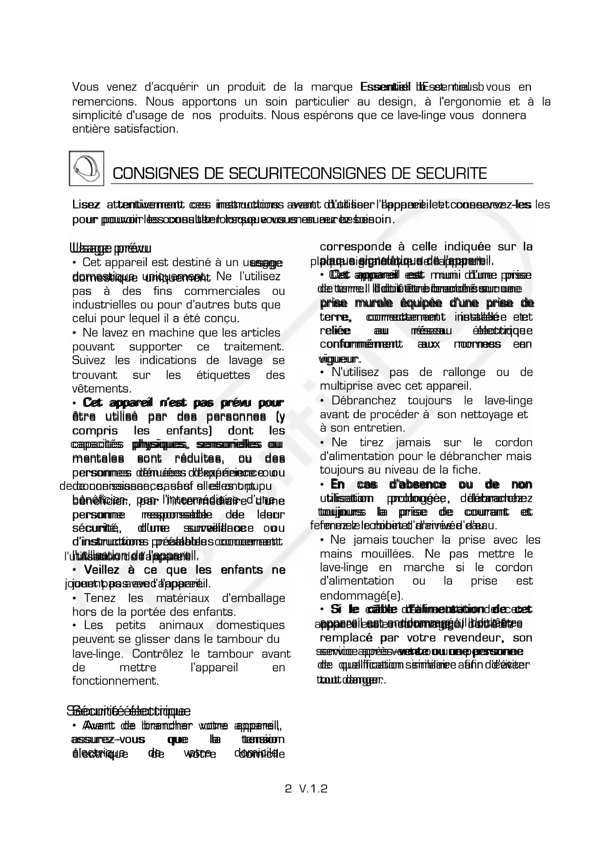 Voues venez d'acquérir un produit de la marque Essentiel tEssentialisbvous en remercions. Nous apportons un soin particulier au design, à l'ergonomie et à la simplicité d'utilisation de nos produits. Nous espérons que ce lave-linge vous donnera entière satisfaction.