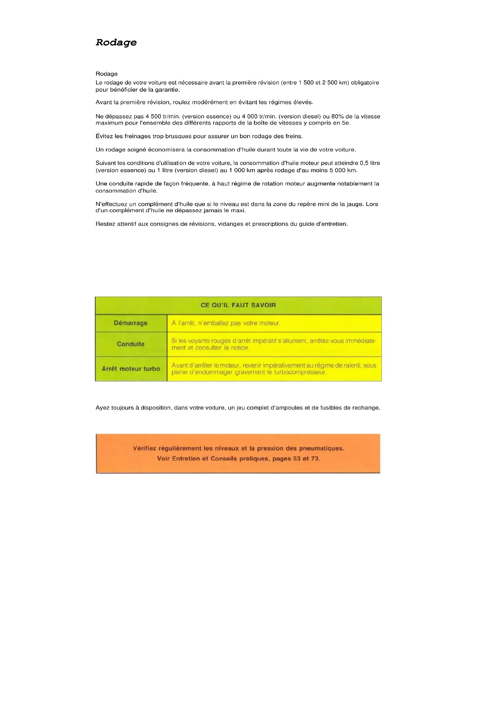 Rodage Rodage Le rodage de votre voiture est nécessaire avant la première révision (entre 1 500 et 2 500 km) obligatoire pour bénéficier de la garantie. Avant la première révision, roulez modérément en évitant les régimes élevés. Ne dépassez pas 4 500 tr/min. (version essence) ou 4 000 tr/min. (version diesel) ou 80% de la vitesse maximum pour l'ensemble des différents rapports de la boîte de vitesses y compris en 5e. Évitez les freinages trop brusques pour assurer un bon rodage des freins. Un rodage soigné économisera la consommation d'huile durant toute la vie de votre voiture. Suivant les conditions d'utilisation de votre voiture, la consommation d'huile moteur peut atteindre 0,5 litre (version essence) ou 1 litre (version diesel) au 1 000 km après rodage d'au moins 5 000 km. Une conduite rapide de façon fréquente, à haut régime de rotation moteur augmente notablement la consommation d'huile. N'effectuez un complément d'huile que si le niveau est dans la zone du repère mini de la jauge. Lors d'un complément d'huile ne dépassez jamais le maxi. Restez attentif aux consignes de révisions, vidanges et prescriptions du guide d'entretien. Ayez toujours à disposition, dans votre voiture, un jeu complet d'ampoules et de fusibles de rechange.Sommaire Catalyseur