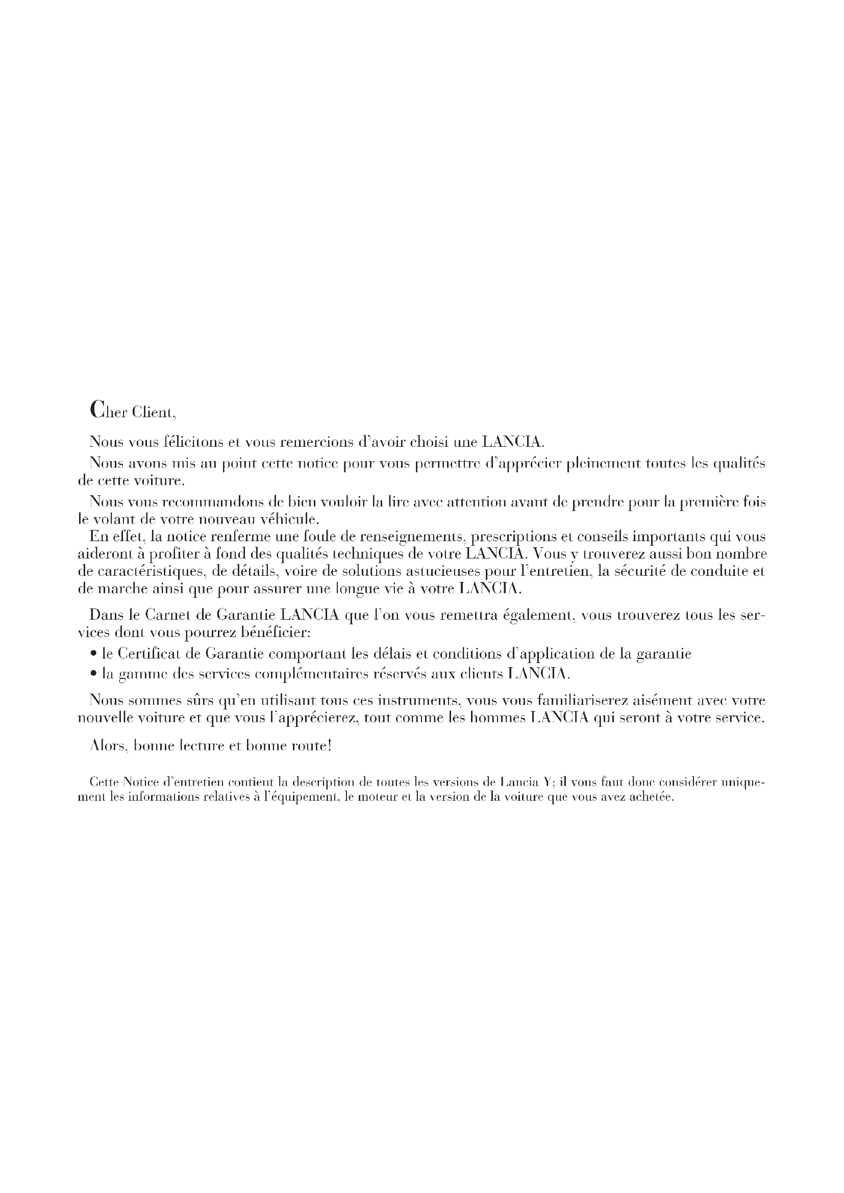 Cher Client, Nous vous félicitons et vous remercions d’avoir choisi une LANCIA. Nous avons mis au point cette notice pour vous permettre d’apprécier pleinement toutes les qualités de cette voiture. Nous vous recommandons de bien vouloir la lire avec attention avant de prendre pour la première fois le volant de votre nouveau véhicule. En effet, la notice renferme une foule de renseignements, prescriptions et conseils importants qui vous aideront à profiter à fond des qualités techniques de votre LANCIA. Vous y trouverez aussi bon nombre de caractéristiques, de détails, voire de solutions astucieuses pour l’entretien, la sécurité de conduite et de marche ainsi que pour assurer une longue vie à votre LANCIA. Dans le Carnet de Garantie LANCIA que l’on vous remettra également, vous trouverez tous les ser- vices dont vous pourrez bénéficier: