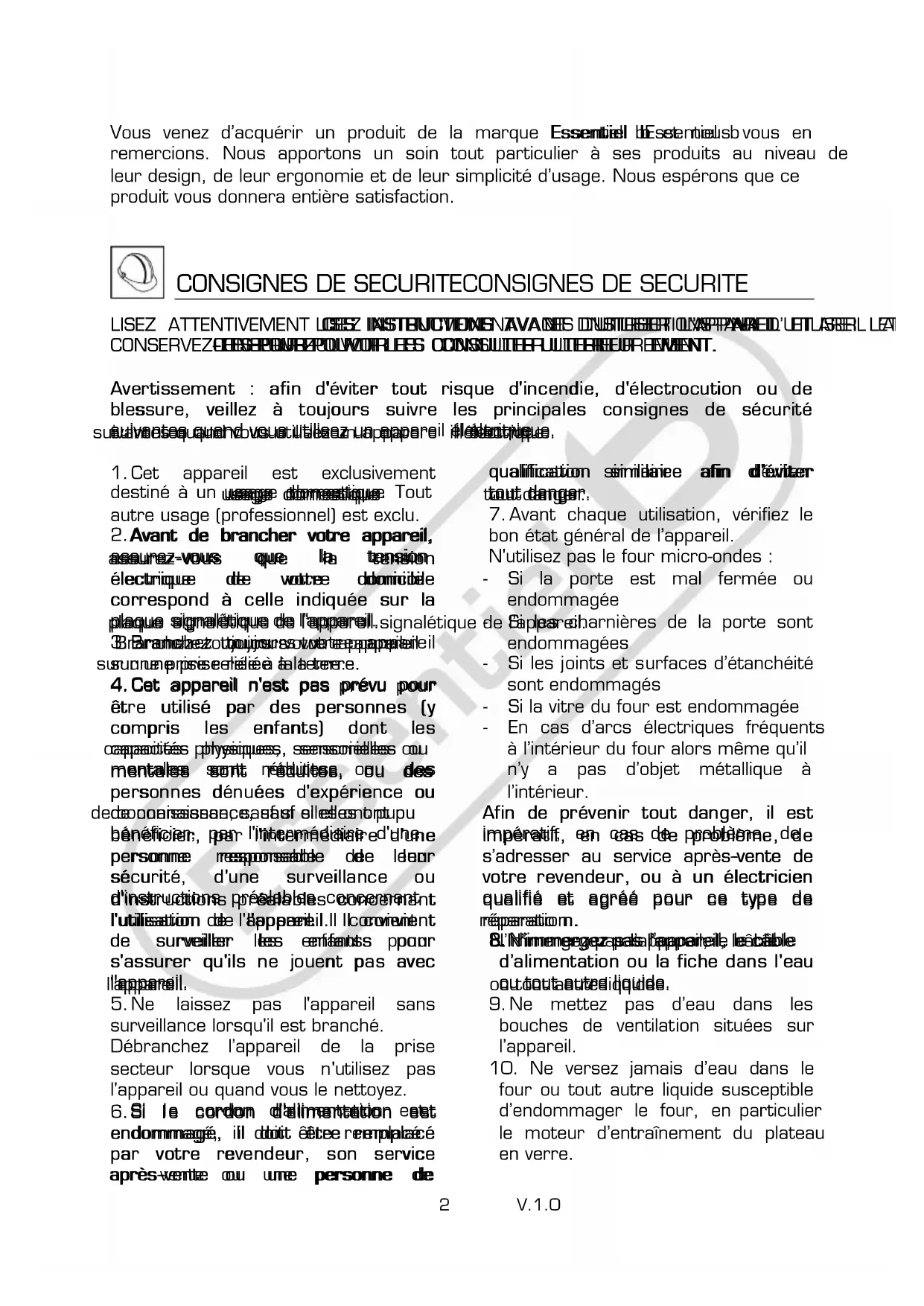four ou tout autre liquide susceptible d’endommager le four, en particulier le moteur d’entraînement du plateau en verre.3 V.1.0