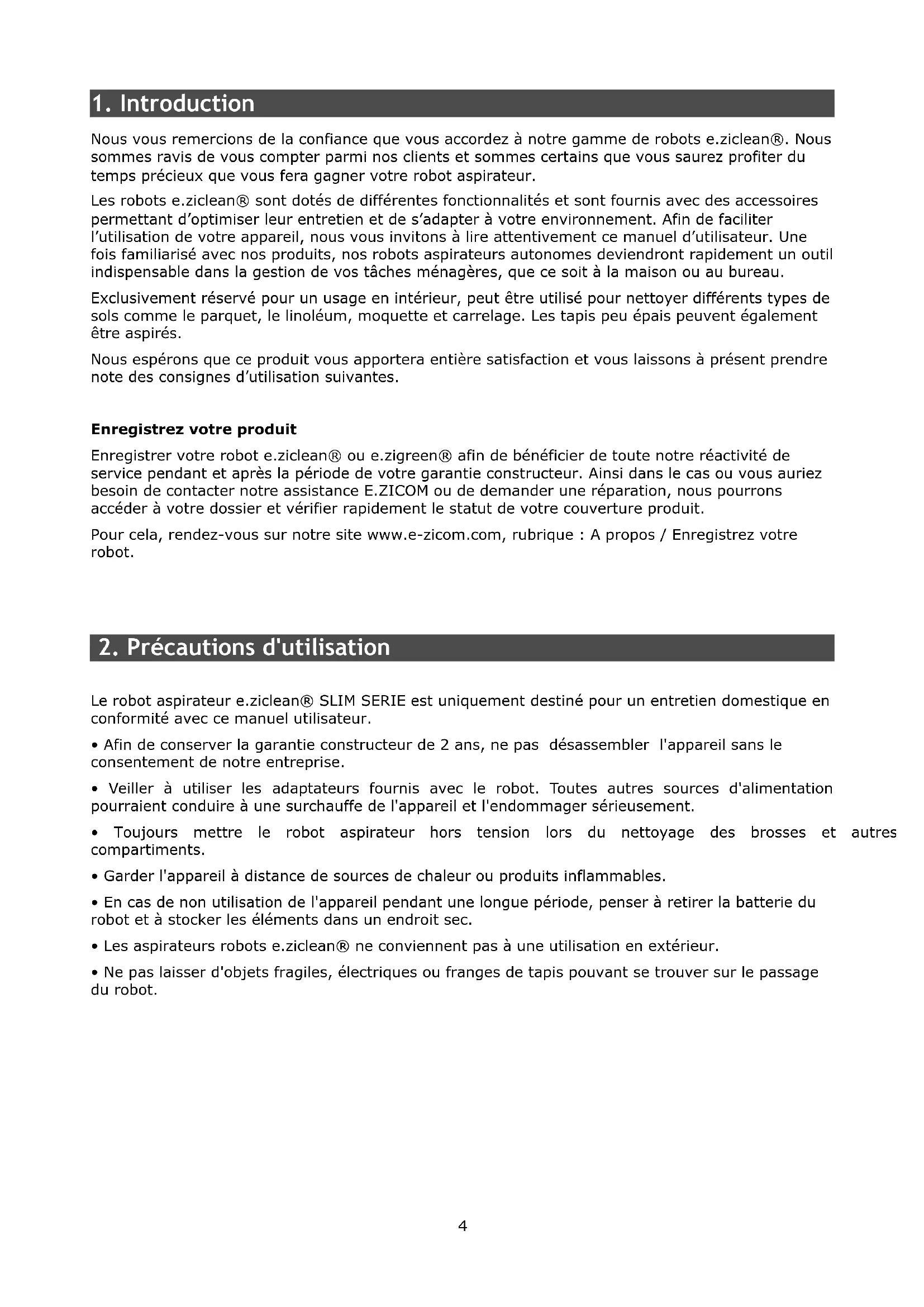 Le robot aspirateur e.ziclean® SLIM SERIE est uniquement destiné pour un entretien domestique en conformité avec ce manuel utilisateur.