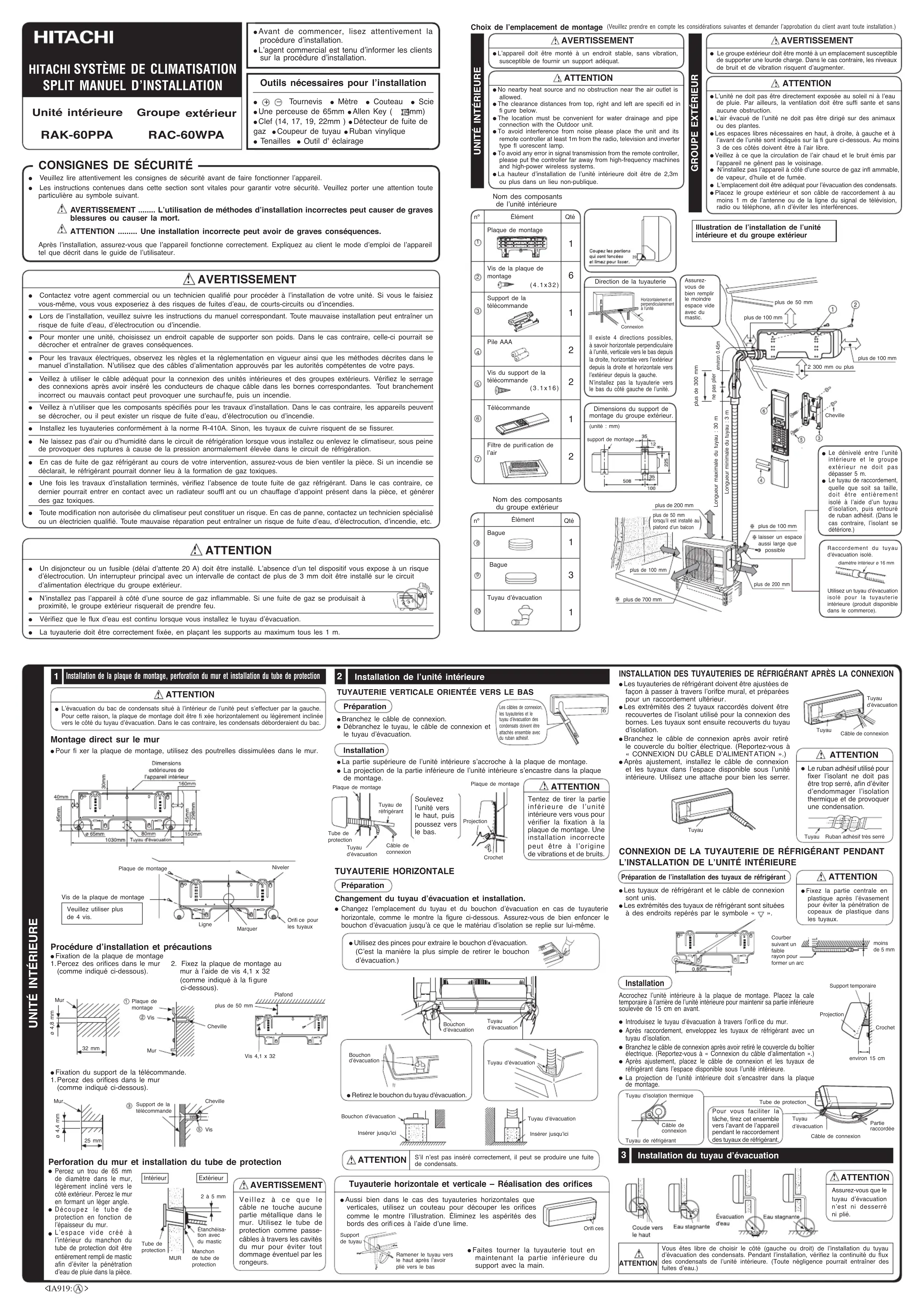 diamètre intérieur ø 16 mmNivelerOri ce pour les tuyauxMarquerLignePlaque de montage Procédure d’installation et précautions ● Fixation de la plaque de montage1. Percez des ori ces dans le mur 2. Fixez la plaque de montage au (comme indiqué ci-dessous).mur à l’aide de vis 4,1 x 32(comme indiqué à la gure ci-dessous).● Fixation du support de la télécommande.1. Percez des ori ces dans le mur(comme indiqué ci-dessous).● Retirez le bouchon du tuyau d'évacuation.Nom des composants de l’unité intérieurePlaque de montageQténº ÉlémentVis du support de la télécommandePile AAASupport de la télécommandeTélécommandeFiltre de puri cation de l’airVis de la plaque de montageBagueNom des composants du groupe extérieurQténºÉlémentTuyau d’évacuationBagueDirection de la tuyauterieIl existe 4 directions possibles, à savoir horizontale perpendiculaire à l’unité, verticale vers le bas depuis la droite, horizontale vers l’extérieur depuis la droite et horizontale vers l’extérieur depuis la gauche.N’installez pas la tuyauterie vers le bas du côté gauche de l’unité.Horizontalement et perpendiculairement à l’unitéConnexionDimensions du support de montage du groupe extérieur.(unité : mm)support de montageIllustration de l’installation de l’unité intérieure et du groupe extérieurAssurez-vous de bien remplir le moindre espace vide avec du mastic.plus de 50 mmplus de 100 mmplus de 100 mm2 300 mm ou plusplus de 300 mmenviron 0.45mne pas plierLongueur maximale du tuyau : 30 mLongueur minimale du tuyau : 3 mplus de 200 mmplus de 100 mmplus de 50 mm lorsqu’il est installé au plafond d’un balconlaisser un espaceaussi large que possibleplus de 100 mmplus de 700 mmplus de 200 mmVis de la plaque de montage Veuillez utiliser plus de 4 vis.Cheville Vis Support de la télécommande25 mmø 4,4 mmø 4,8 mm Mur Mur 32 mm Mur Plaque de montage Vis ChevilleVis 4,1 x 32plus de 50 mmPlafond Perforation du mur et installation du tube de protection