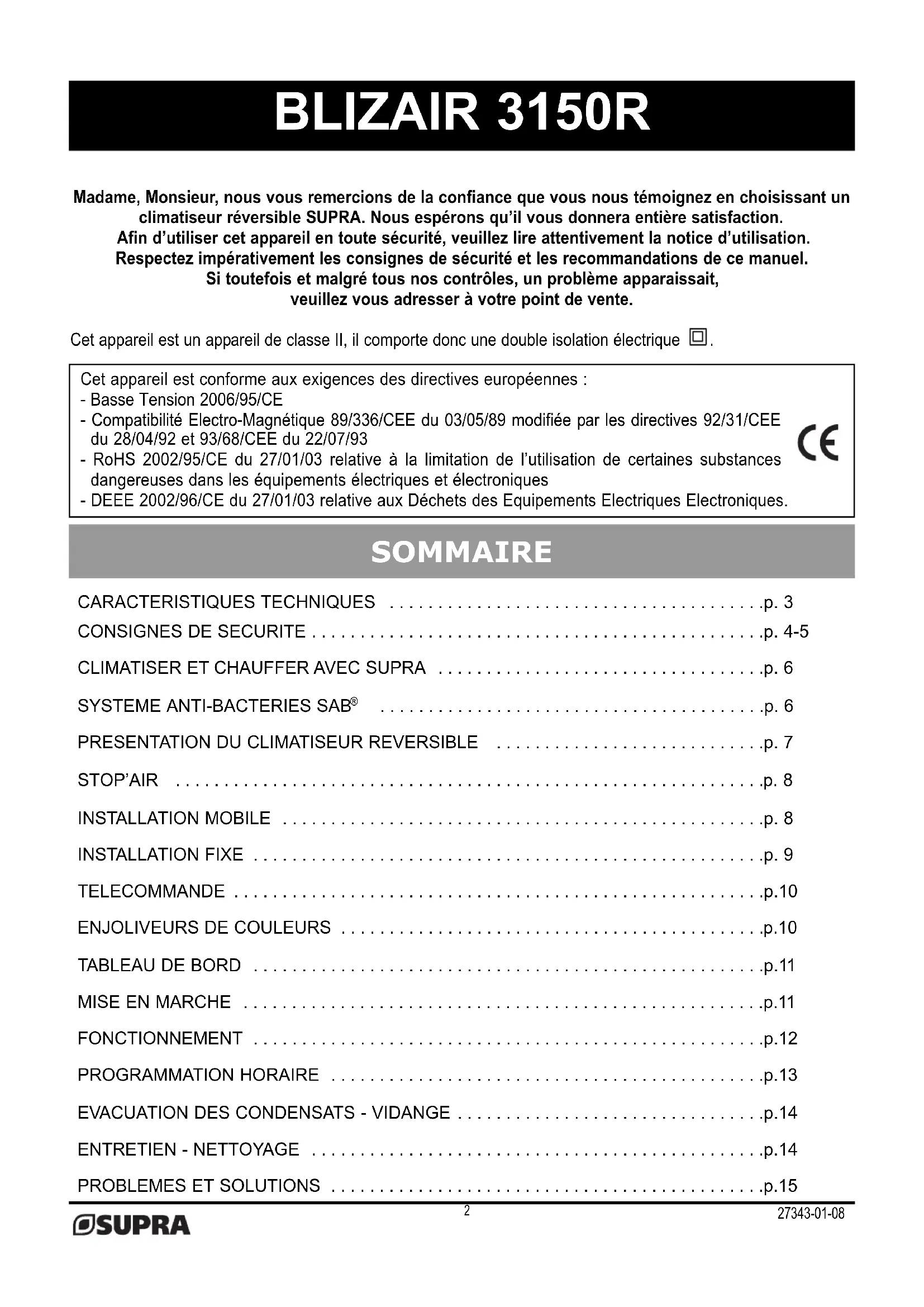 REVERSIBLE 27343-01-082 27343-01-08 BLIZAIR 3150R Madame, Monsieur, nous vous remercions de la confiance que vous nous témoignez en choisissant un climatiseur réversible SUPRA. Nous espérons qu’il vous donnera entière satisfaction. Afin d’utiliser cet appareil en toute sécurité, veuillez lire attentivement la notice d’utilisation. Respectez impérativement les consignes de sécurité et les recommandations de ce manuel. Si toutefois et malgré tous nos contrôles, un problème apparaissait, veuillez vous adresser à votre point de vente. SOMMAIRE CARACTERISTIQUES TECHNIQUES ...p. 3 CONSIGNES DE SECURITE ...p. 4-5 CLIMATISER ET CHAUFFER AVEC SUPRA ...p. 6