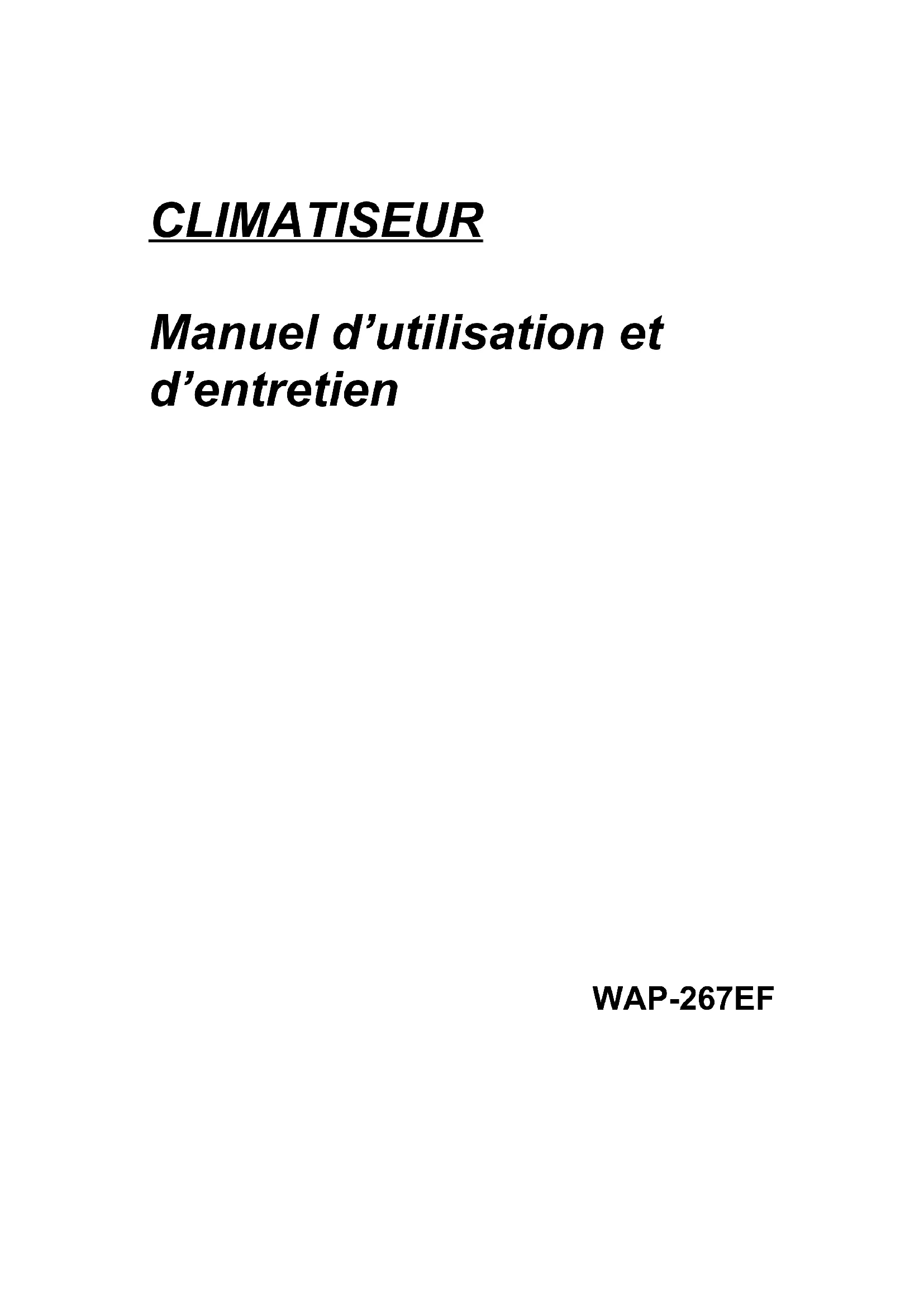 CLIMATISEUR Manuel d’utilisation et d’entretien WAP-267EFIntroduction Merci d’avoir choisi ce climatiseur portatif. Cet appareil répondra aux exigences de toute la famille en matière de confort, que ce soit à la maison, en vacances ou au bureau. Il peut être déplacé d’une pièce à l’autre et son réglage ne prend que quelques minutes. Il s’agit d’un appareil multifonction de traitement et de renouvellement de l’air ambiant doté des fonctions suivantes : climatisation, déshumidification et ventilation indépendante. Dans ce manuel, vous trouverez toutes les informations nécessaires à l’entretien et à la maintenance corrects de votre nouvel appareil. Veuillez lire attentivement les instructions qu’il contient. Ainsi, en cas de maintenance adéquate, votre appareil fonctionnera parfaitement pendant de nombreuses années.