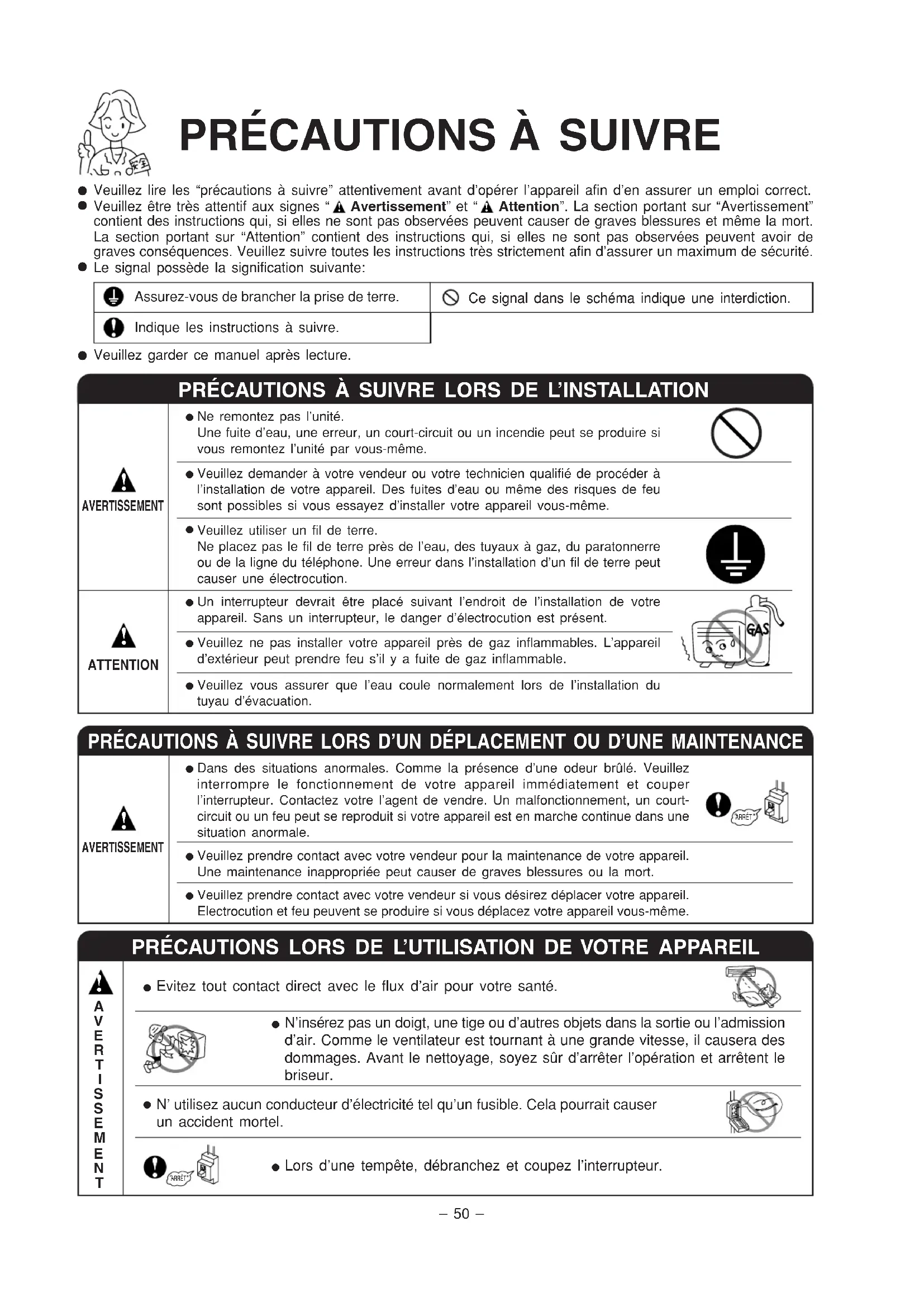 Veuillez prendre contact avec votre vendeur si vous désirez déplacer votre appareil. Electrocution et feu peuvent se produire si vous déplacez votre appareil vous-même. PRÉCAUTIONS LORS DE L’UTILISATION DE VOTRE APPAREIL