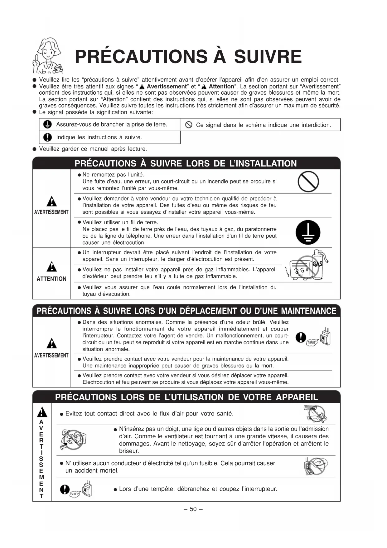 Veuillez être très attentif aux signes “ Avertissement” et “ Attention”. La section portant sur “Avertissement” contient des instructions qui, si elles ne sont pas observées peuvent causer de graves blessures et même la mort. La section portant sur “Attention” contient des instructions qui, si elles ne sont pas observées peuvent avoir de graves conséquences. Veuillez suivre toutes les instructions très strictement afin d’assurer un maximum de sécurité.