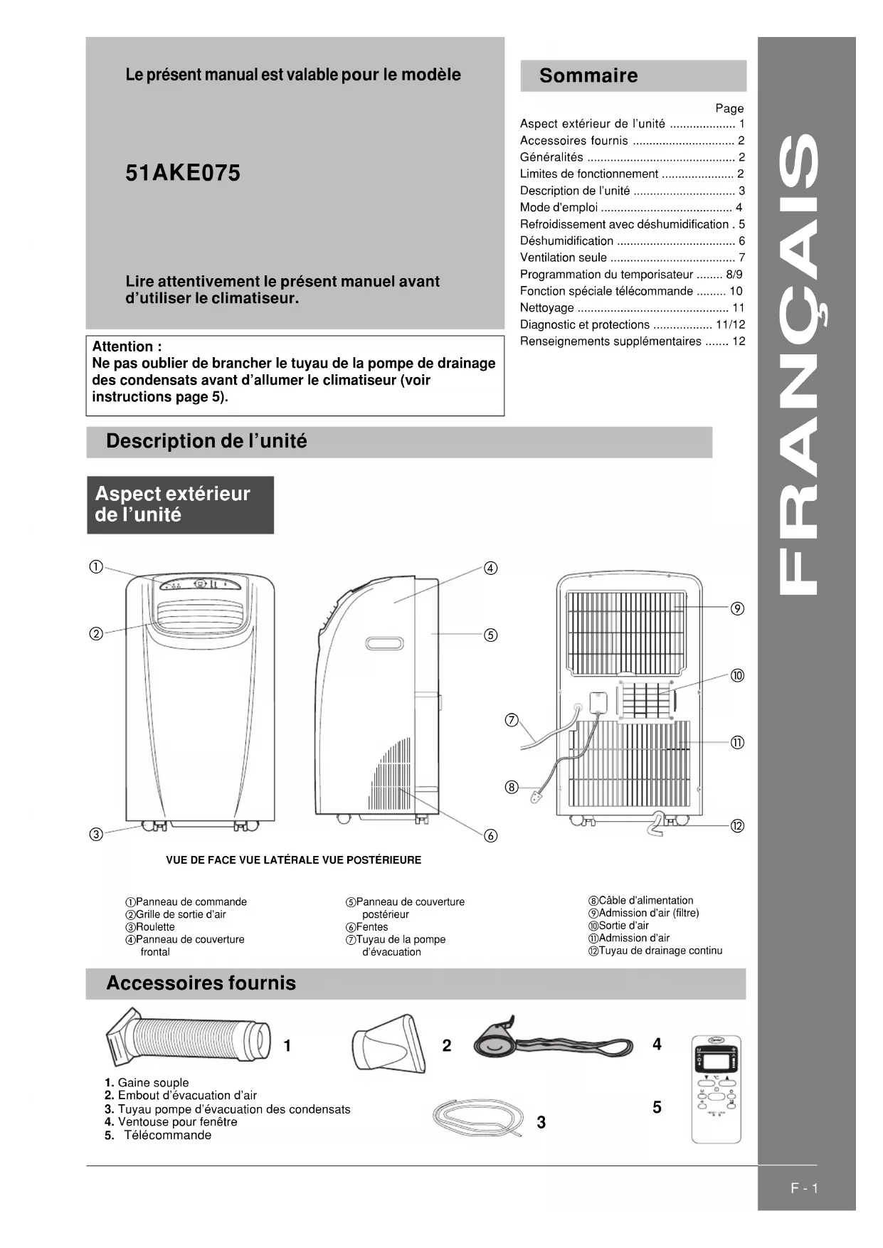 - /12Renseignements supplémentaires Sommaire Le présent manual est valable pour le modèle 51AKE075 Lire attentivement le présent manuel avant d’utiliser le climatiseur. Description de l’unité Aspect extérieur de l’unité VUE DE FACE VUE LATÉRALE VUE POSTÉRIEURE Accessoires fournis p. 12