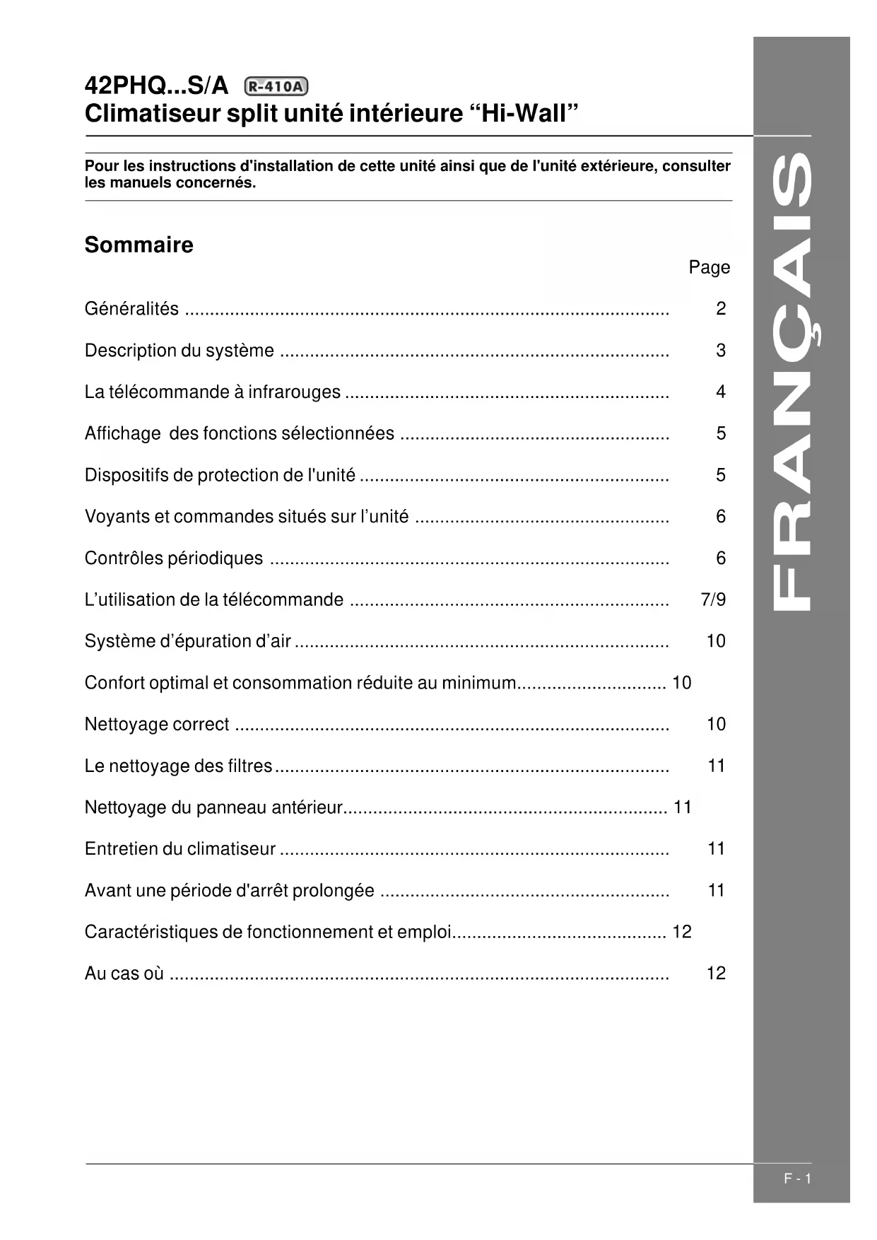 - S/A Climatiseur split unité intérieure “Hi-Wall” FRANÇAIS F - 1 Pour les instructions d'installation de cette unité ainsi que de l'unité extérieure, consulter les manuels concernés. Sommaire Page Généralités p. 2