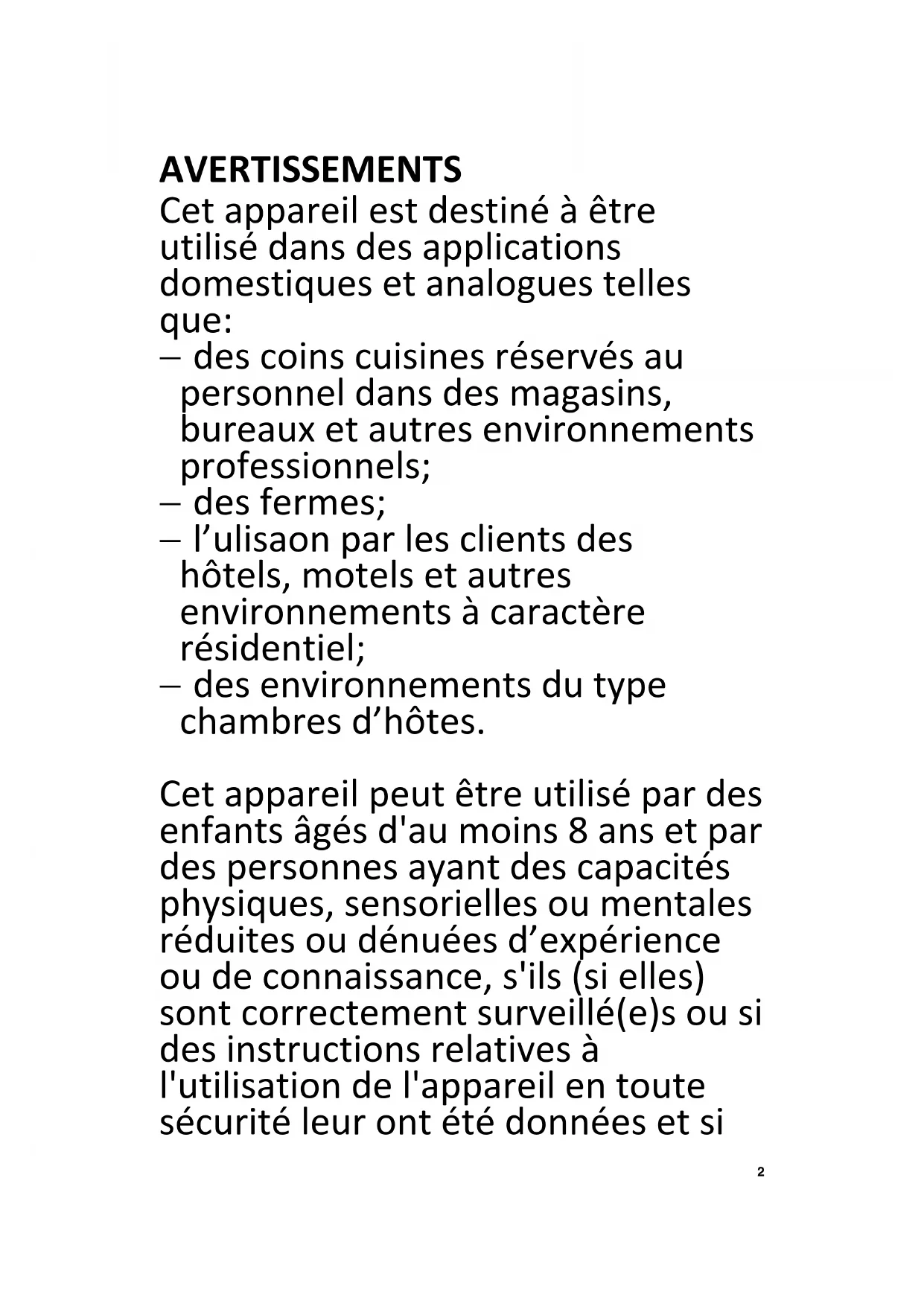 FR2 AVERTISSEMENTS Cet appareil est destiné à être utilisé dans des applications domestiques et analogues telles que: des coins cuisines réservés au personnel dans des magasins, bureaux et autres environnements professionnels; des fermes; l’utilisation par les clients des hôtels, motels et autres environnements à caractère résidentiel; des environnements du type chambres d’hôtes. Cet appareil peut être utilisé par des enfants âgés d'au moins 8 ans et par des personnes ayant des capacités physiques, sensorielles ou mentales réduites ou dénuées d’expérience ou de connaissance, s'ils (si elles) sont correctement surveillé(e)s ou si des instructions relatives à l'utilisation de l'appareil en toute sécurité leur ont été données et si3 les risques encourus ont été appréhendés. Les enfants ne doivent pas jouer avec l’appareil. Le nettoyage et l'entretien par l'usager ne doivent pas être effectués par des enfants sans surveillance. Si le câble d'alimentation est endommagé, il doit être remplacé par le fabricant, son service après vente ou des personnes de qualification similaire afin d'éviter un danger. Les détails concernant la méthode et la fréquence du nettoyage sont définis en page 20 dans la section de “NETTOYAGE ET ENTRETIEN”. Il convient que la porte ne soit pas laissée en position ouverte dans la mesure où cela pourrait présenter un danger de basculement. MISE EN GARDE: Les couteaux et les autres ustensiles pointus doivent être placés dans le panier pointe4 vers le bas ou en position horizontale. Les ensembles de raccordement neufs fournis avec l'appareil doivent être utilisés; il convient de ne pas réutiliser les ensembles de raccordement usagés. Les informations sur la façon de charger le lave-vaisselle sont définies en pages 10 dans la section “CHARGEMENT DES PANIERS”. La pression minimale admissible pour l’arrivée d’eau est de 0.04 MPa. La pression maximale admissible pour l’arrivée d’eau est de 1 MPa. La fiche de prise de courant doit demeurer facilement accessible après l'installation de l'appareil.5 Le nombre maximal de couverts à laver par ce lave-vaisselle est de 14 couverts.