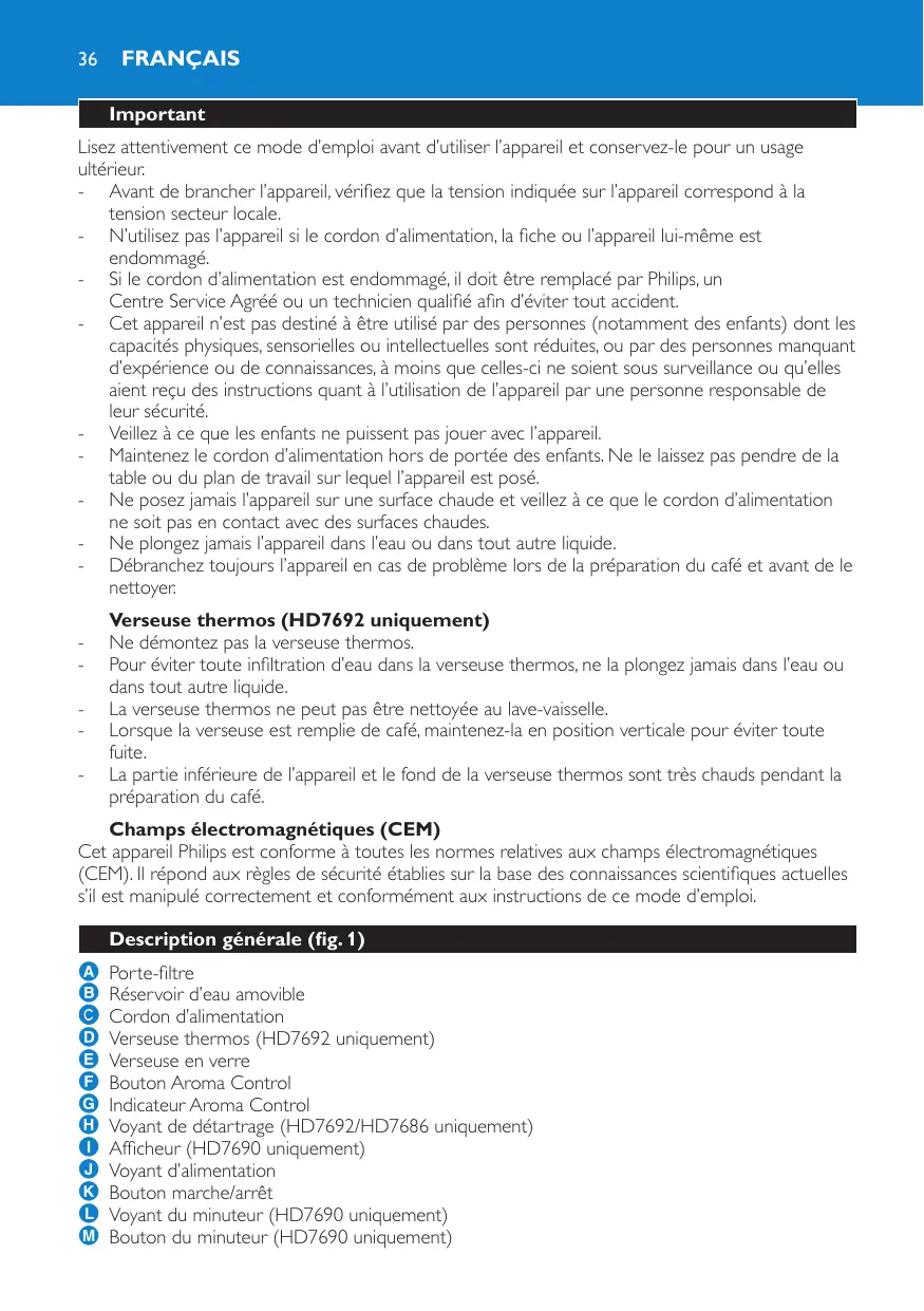 Lisez attentivement ce mode d’emploi avant d’utiliser l’appareil et conservez-le pour un usage ultérieur. - Avant de brancher l’appareil, vérifiez que la tension indiquée sur l’appareil correspond à la tension secteur locale. - N’utilisez pas l’appareil si le cordon d’alimentation, la fiche ou l’appareil lui-même est endommagé. - Si le cordon d’alimentation est endommagé, il doit être remplacé par Philips, un Centre Service Agréé ou un technicien qualifié afin d’éviter tout accident. - Cet appareil n’est pas destiné à être utilisé par des personnes (notamment des enfants) dont les capacités physiques, sensorielles ou intellectuelles sont réduites, ou par des personnes manquant d’expérience ou de connaissances, à moins que celles-ci ne soient sous surveillance ou qu’elles aient reçu des instructions quant à l’utilisation de l’appareil par une personne responsable de leur sécurité. - Veillez à ce que les enfants ne puissent pas jouer avec l’appareil. - Maintenez le cordon d’alimentation hors de portée des enfants. Ne le laissez pas pendre de la table ou du plan de travail sur lequel l’appareil est posé. - Ne posez jamais l’appareil sur une surface chaude et veillez à ce que le cordon d’alimentation ne soit pas en contact avec des surfaces chaudes. - Ne plongez jamais l’appareil dans l’eau ou dans tout autre liquide. - Débranchez toujours l’appareil en cas de problème lors de la préparation du café et avant de le nettoyer.