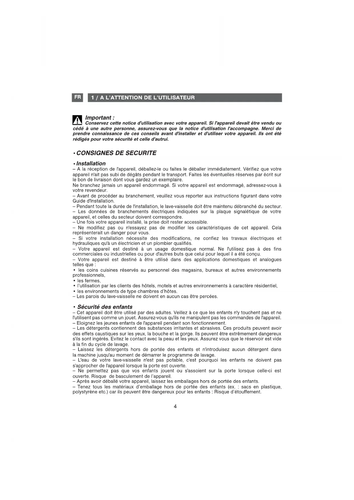 Installation — A la réception de l'appareil, déballez-le ou faites le déballer immédiatement. Vérifiez que votre appareil n'ait pas subi de dégâts pendant le transport. Faites les éventuelles réserves par écrit sur le bon de livraison dont vous gardez un exemplaire. Ne branchez jamais un appareil endommagé. Si votre appareil est endommagé, adressez-vous à votre revendeur. — Avant de procéder au branchement, veuillez vous reporter aux instructions figurant dans votre Guide d'Installation. — Pendant toute la durée de l'installation, le lave-vaisselle doit être maintenu débranché du secteur. — Les données de branchements électriques indiquées sur la plaque signalétique de votre appareil, et celles du secteur doivent correspondre. — Une fois votre appareil installé, la prise doit rester accessible. — Ne modifiez pas ou n'essayez pas de modifier les caractéristiques de cet appareil. Cela représenterait un danger pour vous. — Si votre installation nécessite des modifications, ne confiez les travaux électriques et hydrauliques qu'à un électricien et un plombier qualifiés. — Votre appareil est destiné à un usage domestique normal. Ne l'utilisez pas à des fins commerciales ou industrielles ou pour d'autres buts que celui pour lequel il a été conçu. — Votre appareil est destiné à être utilisé dans des applications domestiques et analogues telles que :