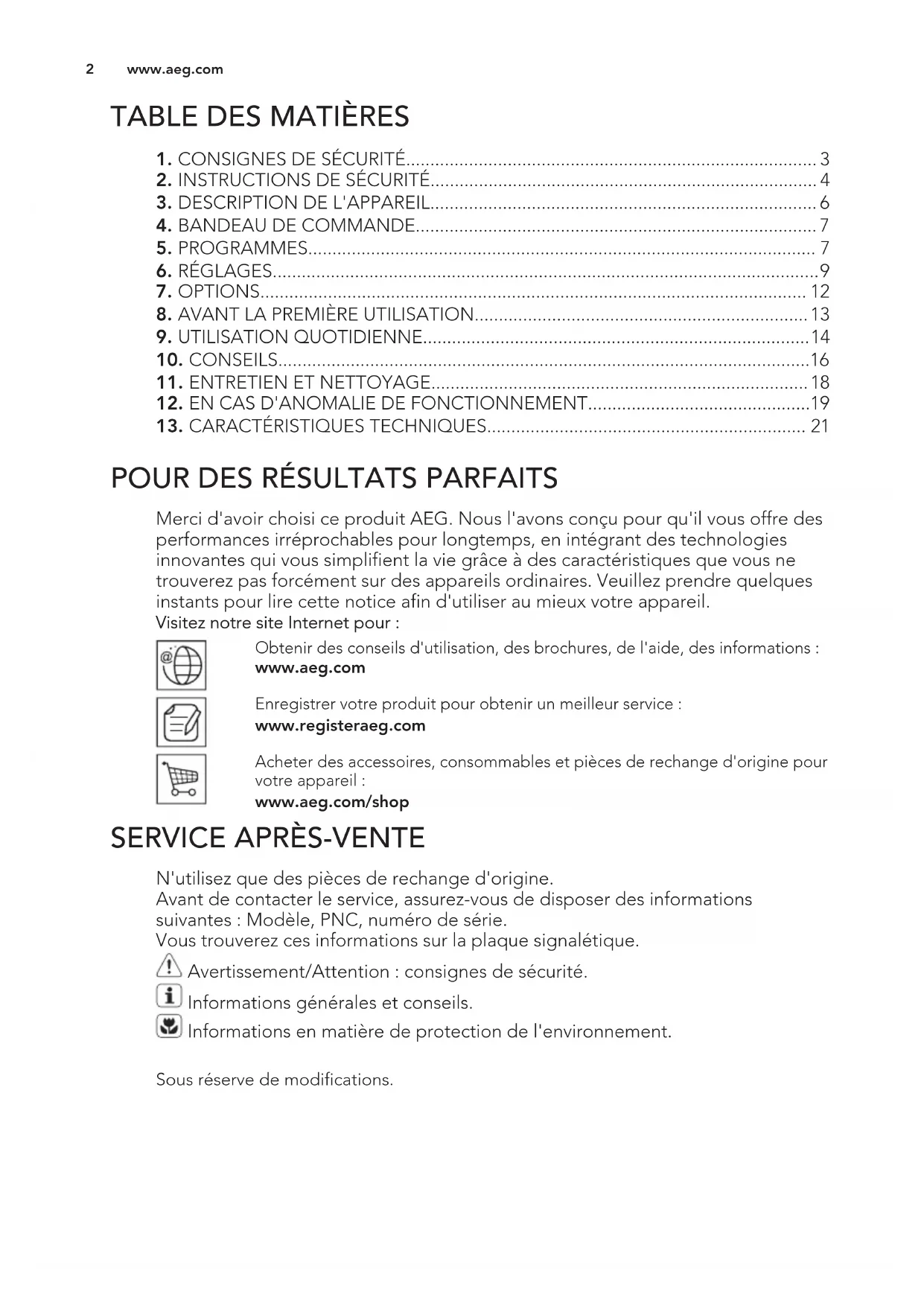 Merci d'avoir choisi ce produit AEG. Nous l'avons conçu pour qu'il vous offre des performances irréprochables pour longtemps, en intégrant des technologies innovantes qui vous simplifient la vie grâce à des caractéristiques que vous ne trouverez pas forcément sur des appareils ordinaires. Veuillez prendre quelques instants pour lire cette notice afin d'utiliser au mieux votre appareil. Visitez notre site Internet pour : Obtenir des conseils d'utilisation, des brochures, de l'aide, des informations : www.aeg.com Enregistrer votre produit pour obtenir un meilleur service : www.registeraeg.com Acheter des accessoires, consommables et pièces de rechange d'origine pour votre appareil : www.aeg.com/shop