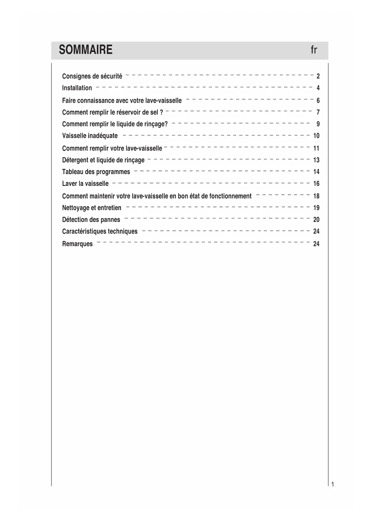 Consignes de sécurité Installation Faire connaissance avec votre lave-vaisselle Comment remplir le réservoir de sel ? Comment remplir le liquide de rinçage? Vaisselle inadéquate Comment remplir votre lave-vaisselle Détergent et liquide de rinçage Tableau des programmes Laver la vaisselle Comment maintenir votre lave-vaisselle en bon état de fonctionnement Nettoyage et entretien Détection des pannes Caractéristiques techniques Remarques