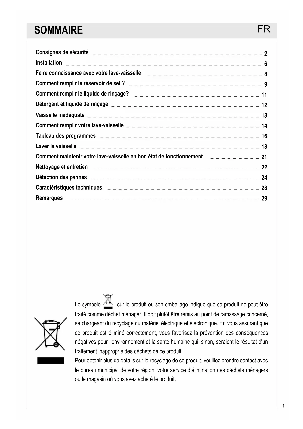 Le symbole sur le produit ou son emballage indique que ce produit ne peut être traité comme déchet ménager. Il doit plutôt être remis au point de ramassage concerné, se chargeant du recyclage du matériel électrique et électronique. En vous assurant que ce produit est éliminé correctement, vous favorisez la prévention des conséquences négatives pour l’environnement et la santé humaine qui, sinon, seraient le résultat d’un traitement inapproprié des déchets de ce produit. Pour obtenir plus de détails sur le recyclage de ce produit, veuillez prendre contact avec le bureau municipal de votre région, votre service d’élimination des déchets ménagers ou le magasin où vous avez acheté le produit. Consignes de sécurité Installation Faire connaissance avec votre lave-vaisselle Comment remplir le réservoir de sel ? Comment remplir le liquide de rinçage? Détergent et liquide de rinçage Vaisselle inadéquate Comment remplir votre lave-vaisselle Tableau des programmes Laver la vaisselle Comment maintenir votre lave-vaisselle en bon état de fonctionnement Nettoyage et entretien Détection des pannes Caractéristiques techniques Remarques