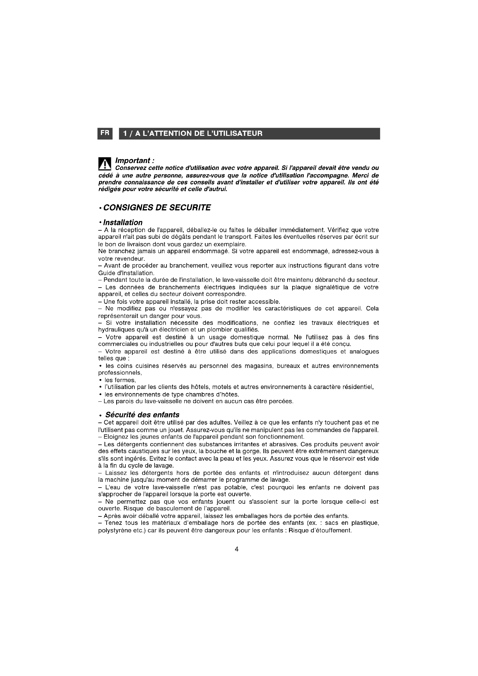 Installation — A la réception de l'appareil, déballez-le ou faites le déballer immédiatement. Vérifiez que votre appareil n'ait pas subi de dégâts pendant le transport. Faites les éventuelles réserves par écrit sur le bon de livraison dont vous gardez un exemplaire. Ne branchez jamais un appareil endommagé. Si votre appareil est endommagé, adressez-vous à votre revendeur. — Avant de procéder au branchement, veuillez vous reporter aux instructions figurant dans votre Guide d'Installation. — Pendant toute la durée de l'installation, le lave-vaisselle doit être maintenu débranché du secteur. — Les données de branchements électriques indiquées sur la plaque signalétique de votre appareil, et celles du secteur doivent correspondre. — Une fois votre appareil installé, la prise doit rester accessible. — Ne modifiez pas ou n'essayez pas de modifier les caractéristiques de cet appareil. Cela représenterait un danger pour vous. — Si votre installation nécessite des modifications, ne confiez les travaux électriques et hydrauliques qu'à un électricien et un plombier qualifiés. — Votre appareil est destiné à un usage domestique normal. Ne l'utilisez pas à des fins commerciales ou industrielles ou pour d'autres buts que celui pour lequel il a été conçu. — Votre appareil est destiné à être utilisé dans des applications domestiques et analogues telles que :