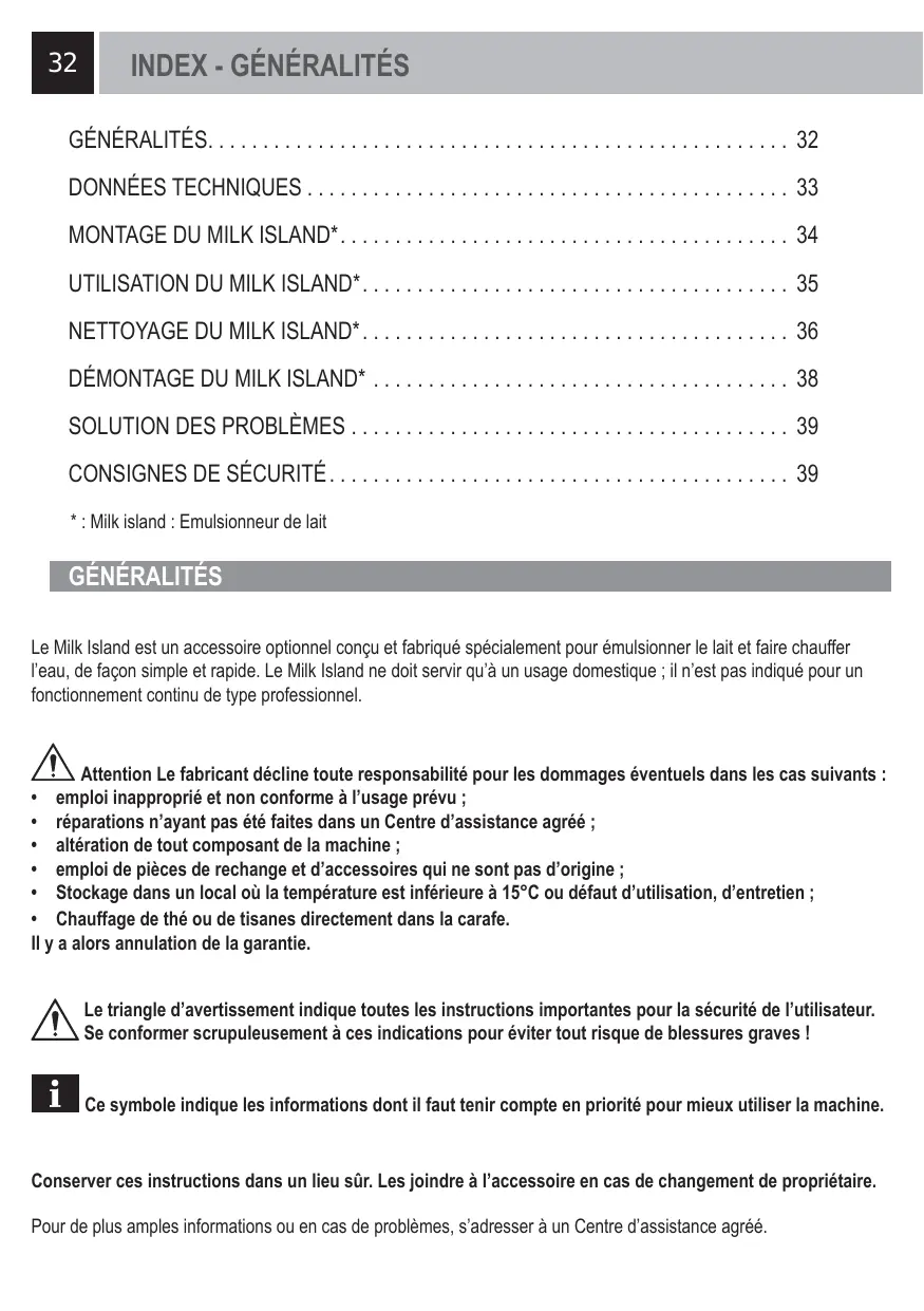 Le Milk Island est un accessoire optionnel concu et fabriqué spécialément pour émulsionner le lait et faire chauffer l'eau, de façon simple et rapide. Le Milk Island ne doit servir qu'à un usage domestique ; il n'est pas indiqué pour un fonctionnement continu de type professionnel.