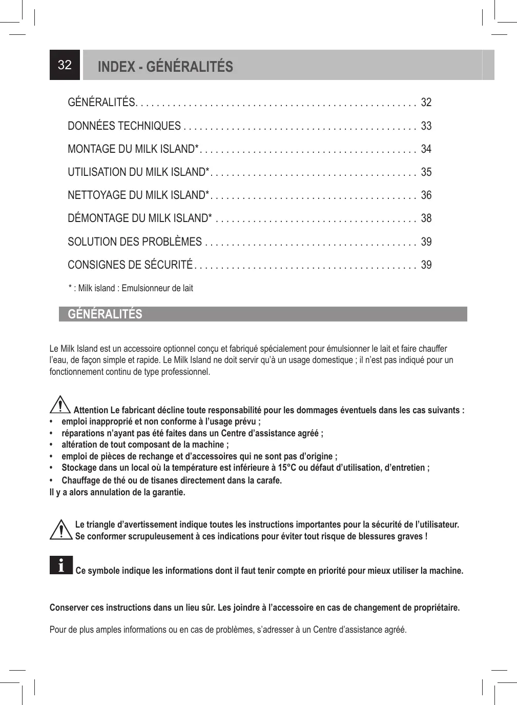 Le Milk Island est un accessoire optionnel concu et fabriqué spécialément pour émulsionner le lait et faire chauffer l'eau, de façon simple et rapide. Le Milk Island ne doit servir qu'à un usage domestique ; il n'est pas indiqué pour un fonctionnement continu de type professionnel.