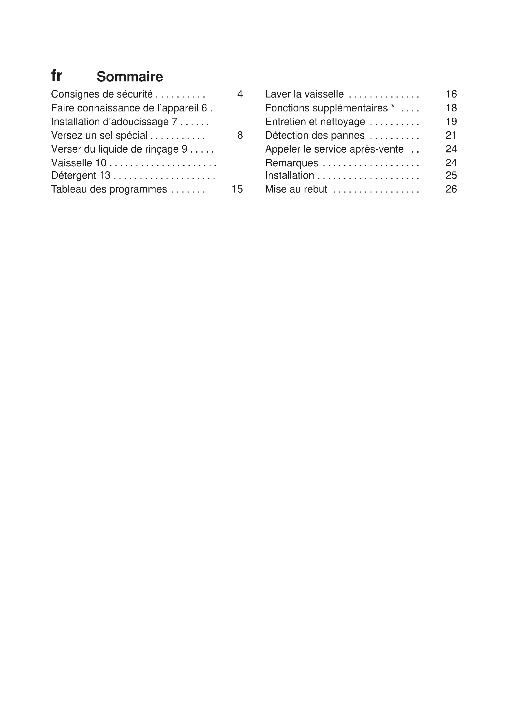 M O D E D ’ E M P L O Ifr Sommaire Consignes de sécurité 4 ... Faire connaissance de l’appareil 6 . Installation d’adoucissage 7 ... Versez un sel spécial 8 ... Verser du liquide de rinçage 9 ... Vaisselle 10 ... Détergent 13 ... Tableau des programmes 15 ... Laver la vaisselle 16 ... Fonctions supplémentaires * 18 ... Entretien et nettoyage 19 ... Détection des pannes 21 ... Appeler le service après-vente 24 ... Remarques 24 ... Installation 25 ... Mise au rebut 26 ...fr