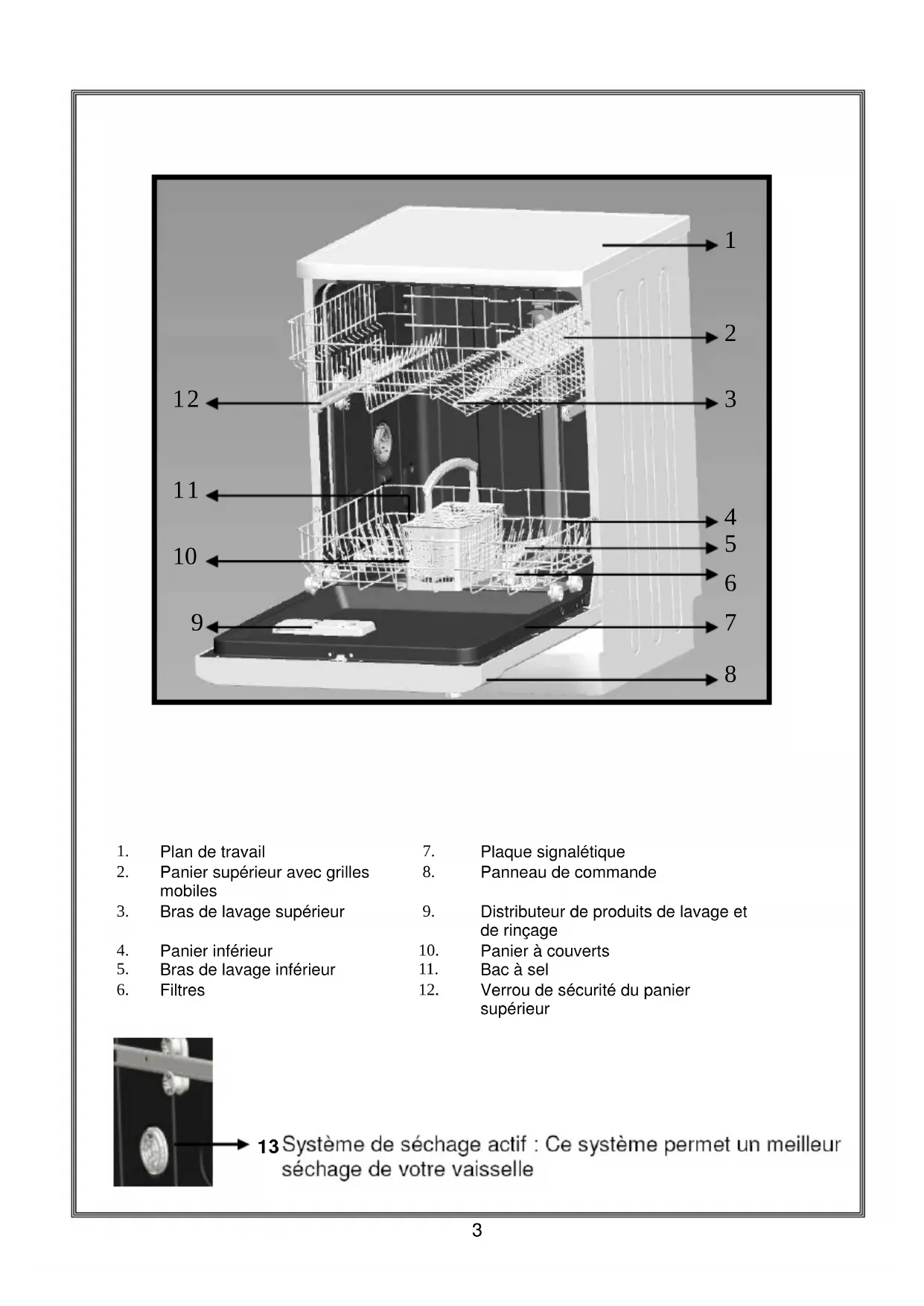 Plan de travail 7. Plaque signalétique Panier supérieur avec grilles mobiles 8. Panneau de commande Bras de lavage supérieur 9. Distributeur de produits de lavage et de rinçage Panier inférieur 10. Panier à couverts Bras de lavage inférieur 11. Bac à sel Filtres 12. Verrou de sécurité du panier supérieur