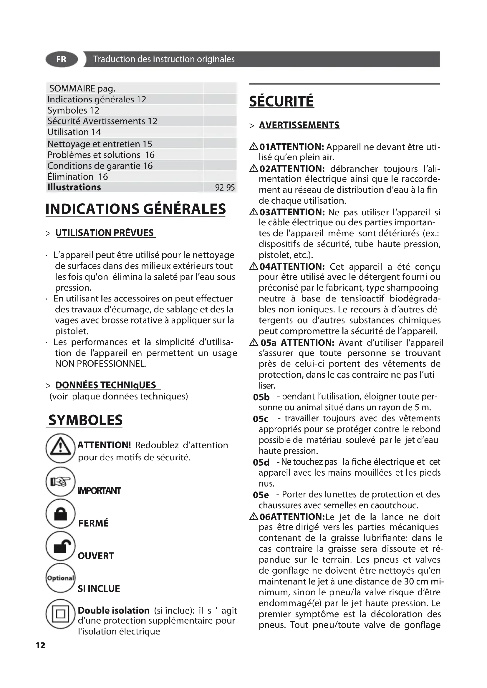 - Les performances et la simplicité d’utilisa- tion de l’appareil en permettent un usage NON PROFESSIONNEL. > DONNÉES TECHNIqUES (voir plaque données techniques) SYMBOLES ATTENTION! Redoublez d’attention pour des motifs de sécurité. IMPORTANT FERMÉ OUVERT SI INCLUE Double isolation (si inclue): il s ' agit d'une protection supplémentaire pour l'isolation électrique SÉCURITÉ > AVERTISSEMENTS