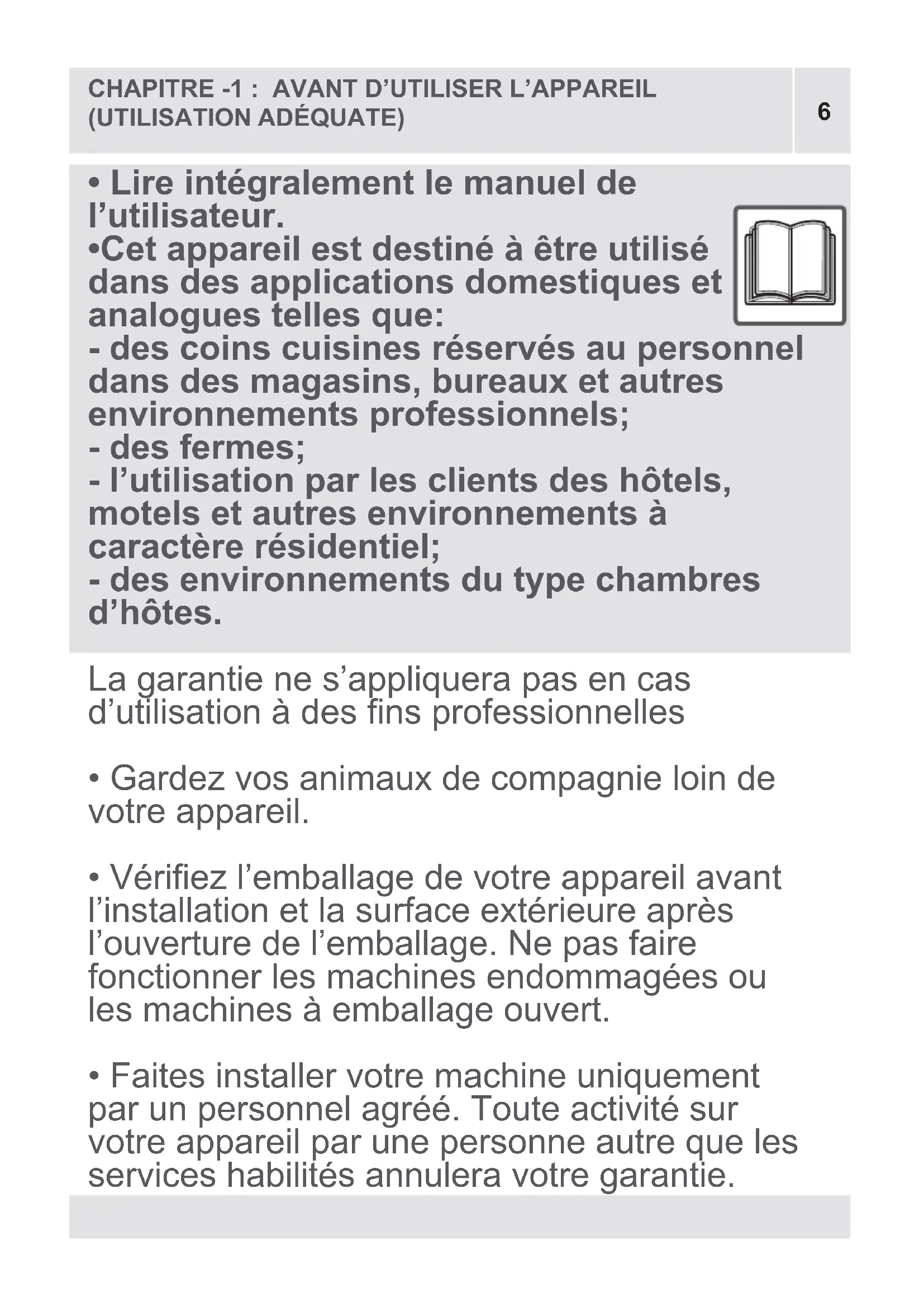 - Faitesinstallervotremachineuniquement parunpersonnelagréé.Touteactivitésur votreappareilparunepersonneautrequeles serviceshabilitésannuleravotregarantie.7 CHAPITRE -1 : AVANT D’UTILISER L’APPAREIL (UTILISATION ADÉQUATE)