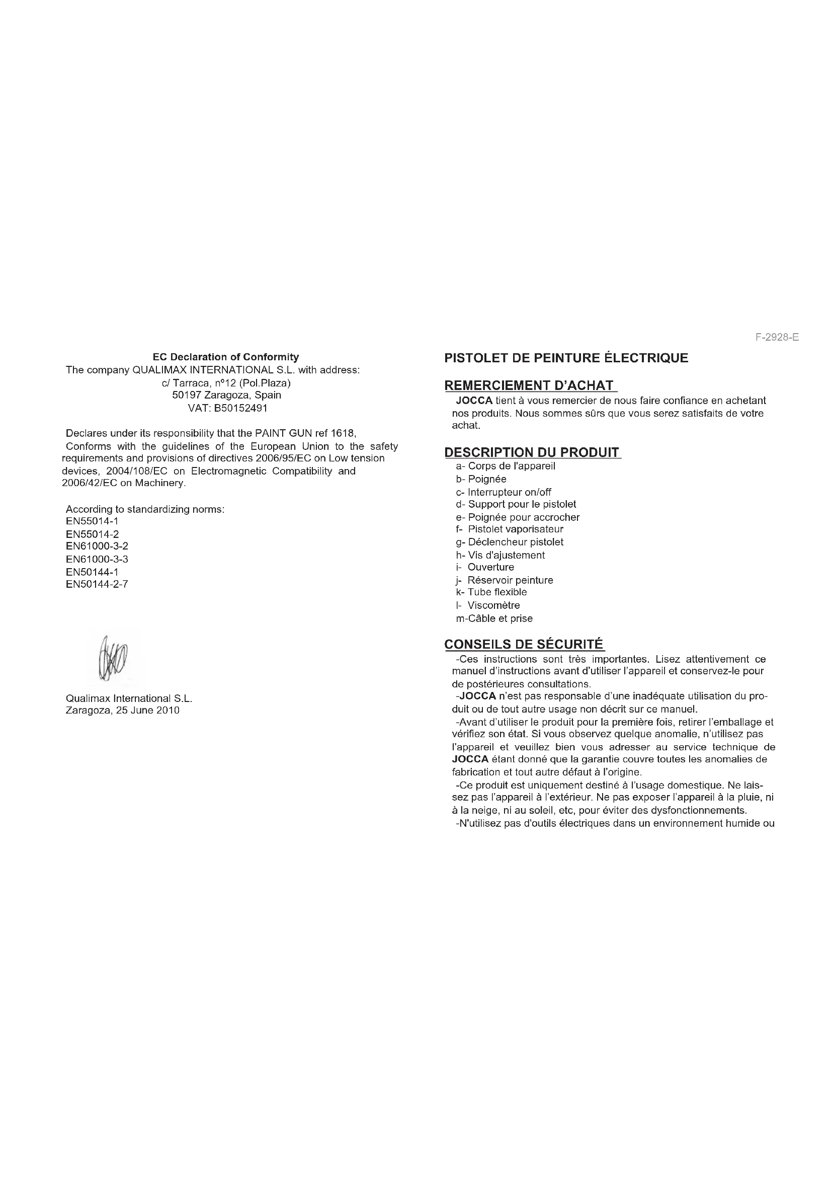 | Caractéristiques techniques | Jet de peinture électrique JOCCA 1618 |