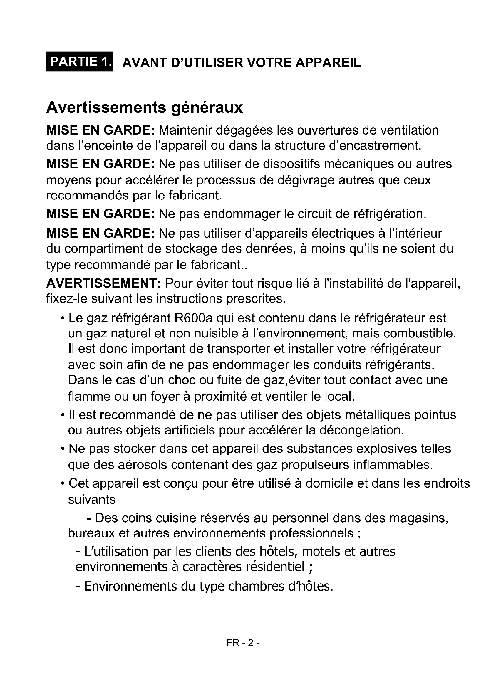 MISE EN GARDE: Ne pas utiliser de dispositifs mécaniques ou autres moyens pour accélérer le processus de dégivrage autres que ceux recommandés par le fabricant.