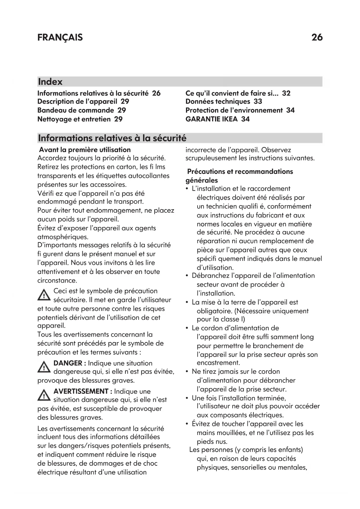 - Évitez de toucher l’appareil avec les mains mouillées, et ne l’utilisez pas les pieds nus. Les personnes (y compris les enfants) qui, en raison de leurs capacités physiques, sensorielles ou mentales, Informations relatives à la sécurité 26 Description de l’appareil 29 Bandeau de commande 29 Nettoyage et entretien 29 Ce qu’il convient de faire si... 32 Données techniques 33 Protection de l’environnement 34 GARANTIE IKEA 34 Informations relatives à la sécurité IndexFRANÇAIS 27 de leur inexpérience ou de leur méconnaissance, ne sont pas en mesure d’utiliser l’appareil en toute sécurité, doivent se servir de l’appareil uniquement sous la surveillance ou en se conformant aux instructions d’une personne responsable.