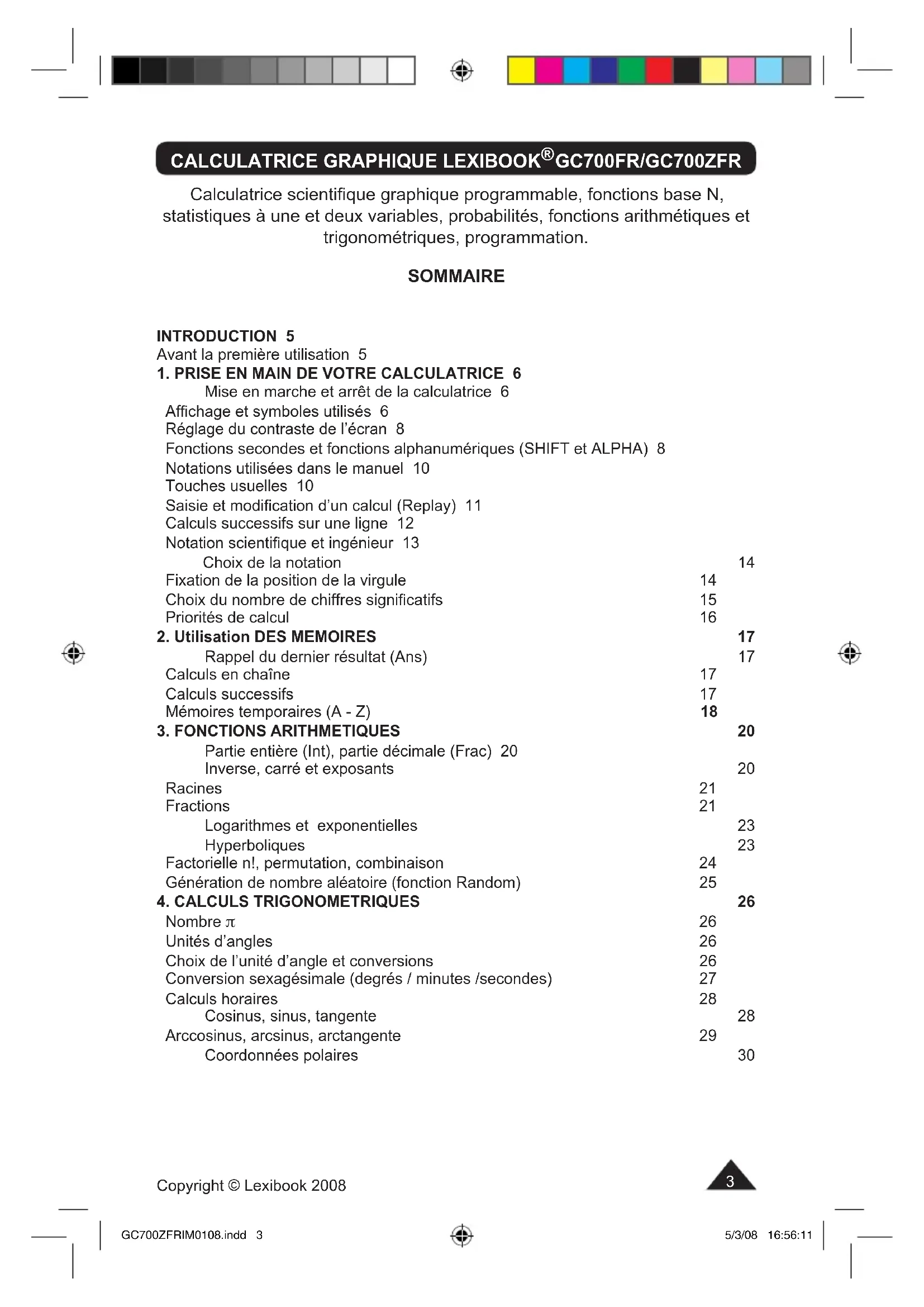 GC700ZFRIM0108.indd 1 5/3/08 16:56:112 Copyright © Lexibook 2008 GC700ZFRIM0108.indd 2 5/3/08 16:56:113 Copyright © Lexibook 2008 Calculatrice scientique graphique programmable, fonctions base N, statistiques à une et deux variables, probabilités, fonctions arithmétiques et trigonométriques, programmation. SOMMAIRE INTRODUCTION 5 Avant la première utilisation 5