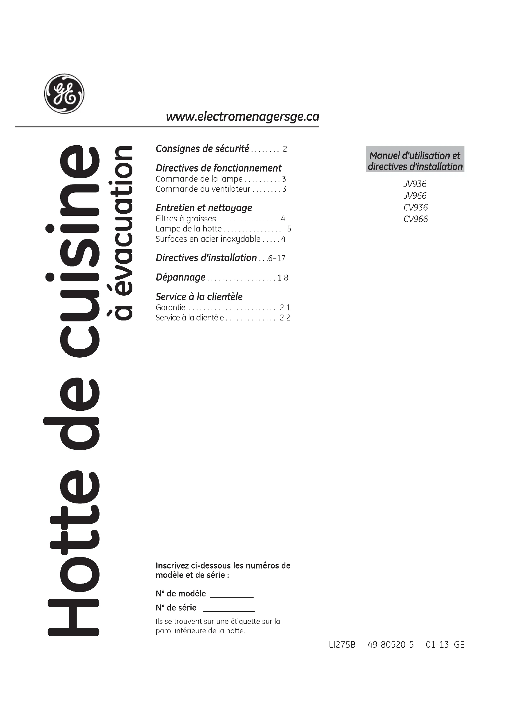 Notes.20 Notes.Pour la période de : Ce qui remplacera : Une année Toute pièce déta chée de la hotte de cuisine qui tomberait en panne à cause d’un défaut À partir de la date matériel ou de main-d’ouvre. Pendant cette garantie limitée d’une année, GE fournira aussi, d’achat originale gratuitement, toute main-d’ouvre et service à domicile pour remplacer la pièce défectueuse. Les déplacements à domicile pour vous apprendre à utiliser l’appareil. Une installation, une livraison ou une maintenance incorrecte. Défaillance ou dommage du produit s’il est maltraité, mal utilisé, modifié, utilisé à d’autres fins que l’usage prévu, ou utilisé commercialement. Le remplacement des fusibles du domicile ou la réinitialisation des disjoncteurs. Un dommage de l’appareil provoqué par un accident, un incendie, une inondation ou un cas de force majeure. Tout dommage direct ou indirect causé par une défectuosité possible de cet appareil. Un dommage provoqué après la livraison. Un appareil non accessible pour exécuter la réparation nécessaire. Installation ou entretien pour système de compensation d’air (remplacement). Ce qui n’est pas couvert : Garantie GE de la hotte de cuisine. Toutes les réparations sous garantie sont effectuées par nos Centres de réparation ou par nos réparateurs Mabe autorisés. Pour obtenir du service en ligne, veuillez nous visiter au site www. electromenagersge.ca ou appelez le no 1.800.561.3344. Veuillez fournir le numéro de série et le numéro de modèle lorsque vous appelez pour obtenir le service. Agrafez votre facture ici. La preuve d’achat originale sera nécessaire pour bénéficier des services de garantie.