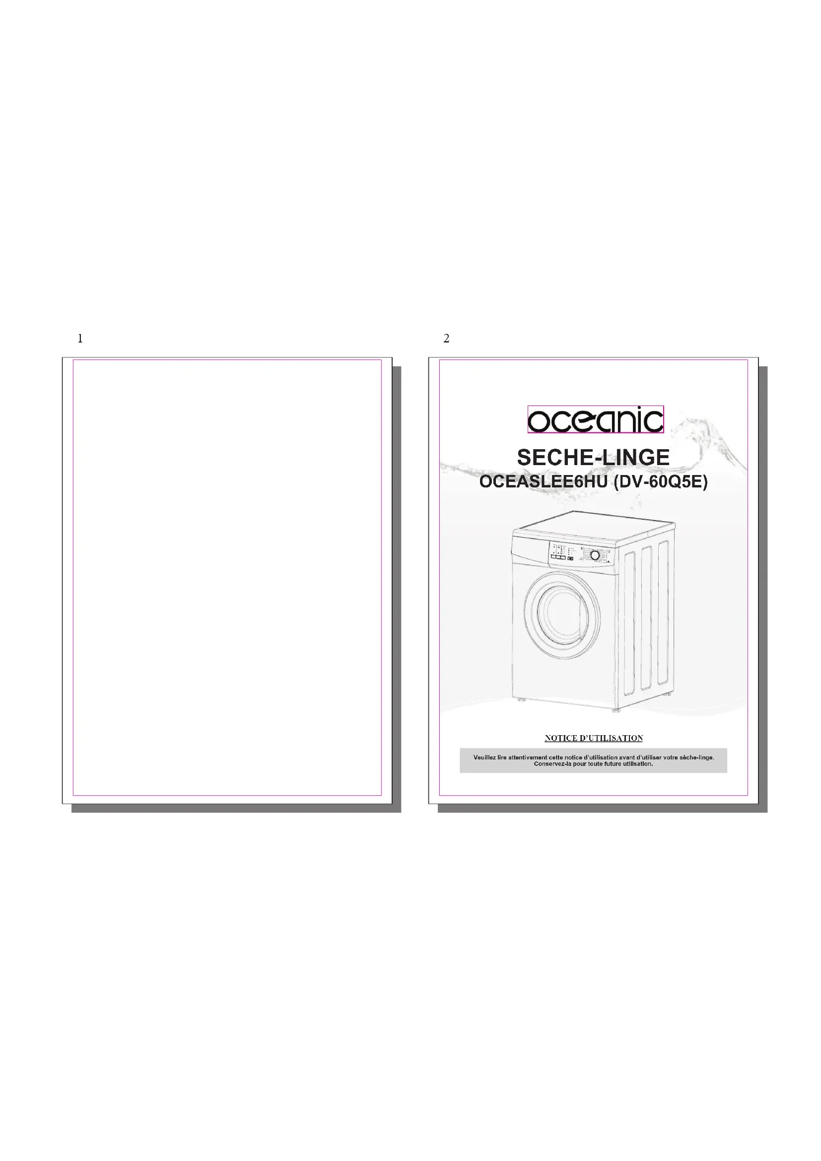 Veuillez lire attentivement cette notice d’utilisation avant d’utiliser votre sèche-linge. Conservez-la pour toute future utilisation. SECHE-LINGE OCEASLEE6HU (DV-60Q5E) Schageapide Dlicat Dpart diffr (3h) (6h) (12h)Refroidissement Fin FiltreRafrachirAir froidFragileIntensif 30Õ 60Õ 90Õ Extra secCotonSpcialinuterieSnthtiueTrs secNormalHumidePrt repasserExtra secPrt rangerPrt repasser3 Les symboles suivants sont utilisés dans cette notice : Informations importantes concernant votre sécurité et comment éviter d’endommager l’appareil. Informations générales et conseils. Informations environnementales. PREFACE Nous vous remercions d’avoir choisi notre sèche-linge. Veuillez lire attentivement cette notice. Elle fournit des instructions sur l’utilisation et l’entretien de cet appareil. Conservez-la afi n de pouvoir y revenir ultérieurement. Notez sur cette notice le numéro du modèle et le numéro de série de votre machine. II faudra fournir cette information à votre revendeur si vous avez besoin d’une révision.