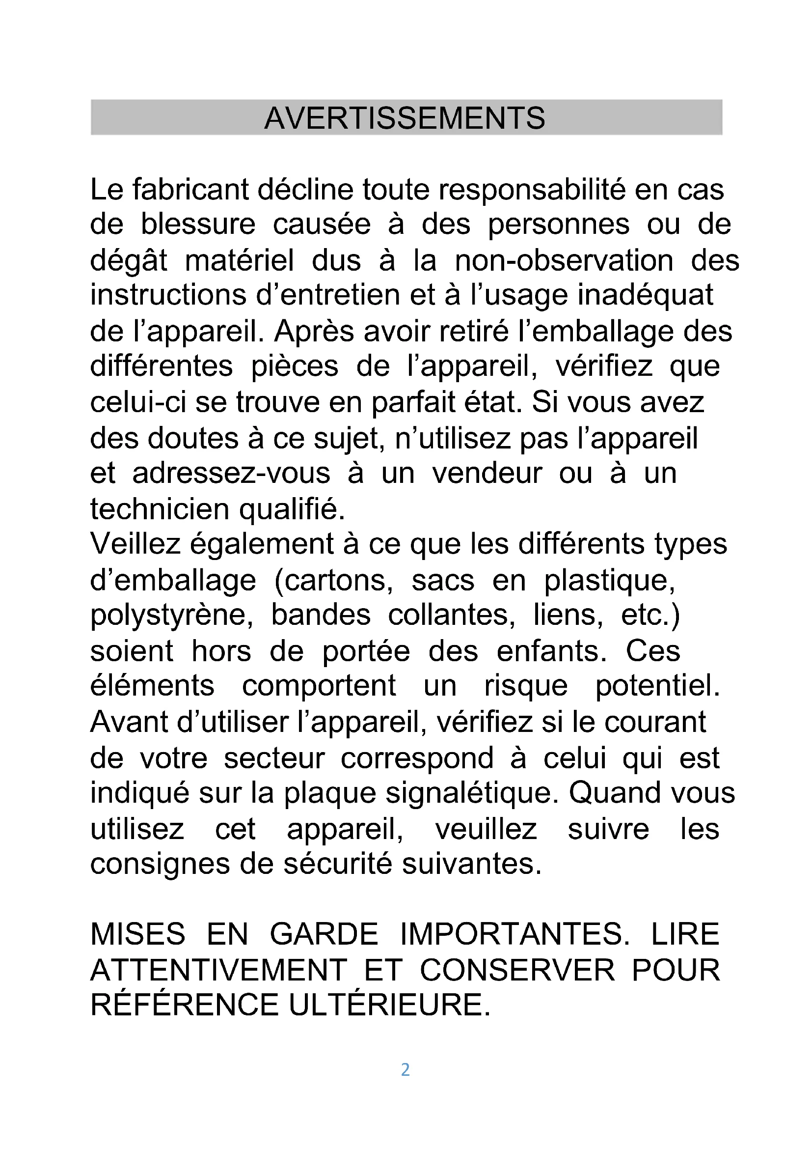 Le fabricant décline toute responsabilité en cas de blessure causée à des personnes ou de dégât matériel dus à la non-observation des instructions d’entretien et à l’usage inadéquat de l’appareil. Après avoir retiré l’emballage des différentes pièces de l’appareil, vérifiez que celui-ci se trouve en parfait état. Si vous avez des doutes à ce sujet, n’utilisez pas l’appareil et adressez-vous à un vendeur ou à un technicien qualifié. Veillez également à ce que les différents types d’emballage (cartons, sacs en plastique, polystyrène, bandes collantes, liens, etc.) soient hors de portée des enfants. Ces éléments comportent un risque potentiel. Avant d’utiliser l’appareil, vérifiez si le courant de votre secteur correspond à celui qui est indiqué sur la plaque signalétique. Quand vous utilisez cet appareil, veuillez suivre les consignes de sécurité suivantes.