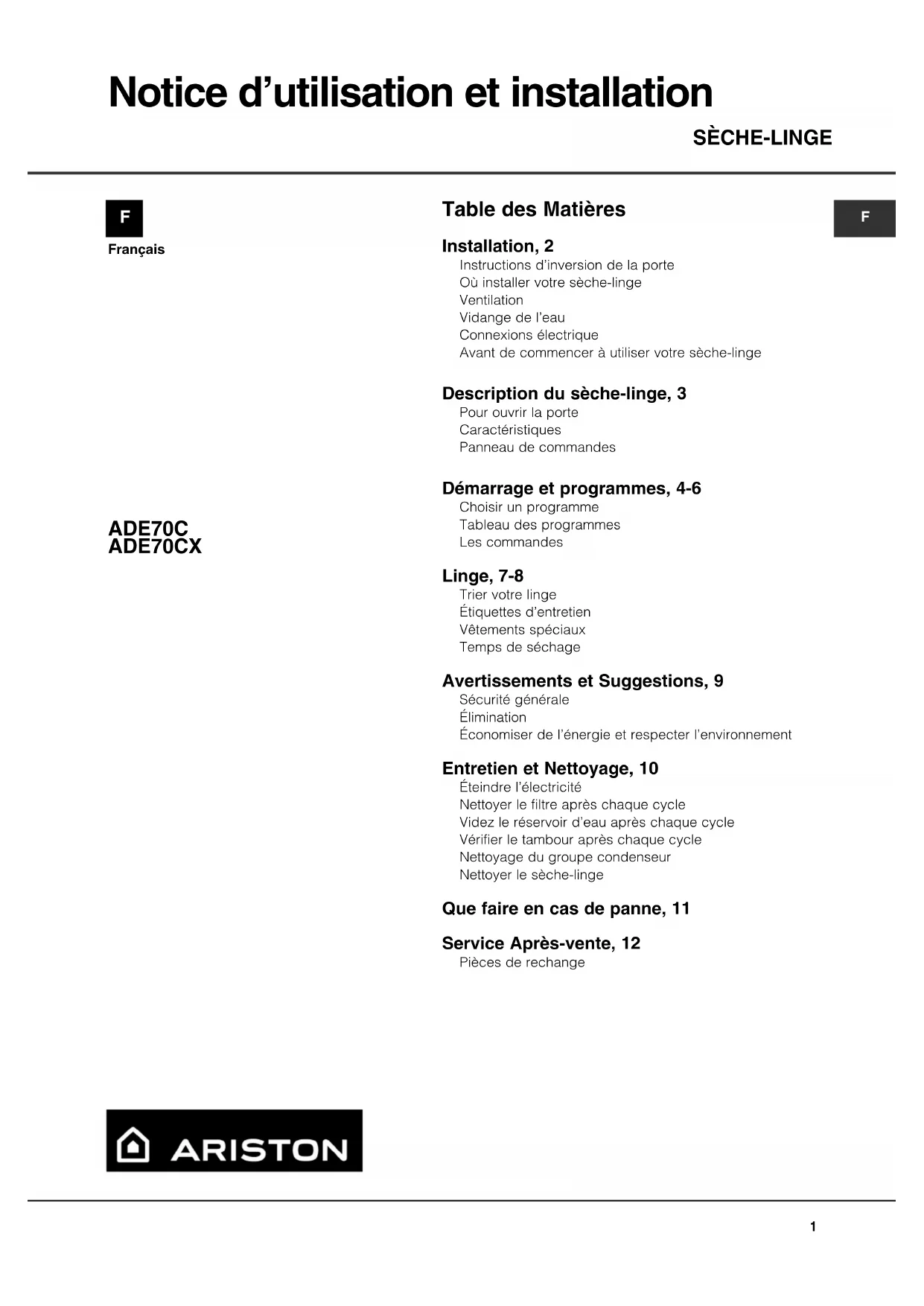 Table des Matières SÈCHE-LINGE ADE70C ADE70CX Notice d’utilisation et installation Installation, 2 Instructions d’inversion de la porte Où installer votre sèche-linge Ventilation Vidange de l’eau Connexions électrique Avant de commencer à utiliser votre sèche-linge Description du sèche-linge, 3 Pour ouvrir la porte Caractéristiques Panneau de commandes Démarrage et programmes, 4-6 Choisir un programme Tableau des programmes Les commandes Linge, 7-8 Trier votre linge Étiquettes d’entretien Vêtements spéciaux Temps de séchage Avertissements et Suggestions, 9 Sécurité générale Élimination Économiser de l’énergie et respecter l’environnement Entretien et Nettoyage, 10 Éteindre l’électricité Nettoyer le filtre après chaque cycle Videz le réservoir d’eau après chaque cycle Vérifier le tambour après chaque cycle Nettoyage du groupe condenseur Nettoyer le sèche-linge Que faire en cas de panne, 11 Service Après-vente, 12 Pièces de rechange