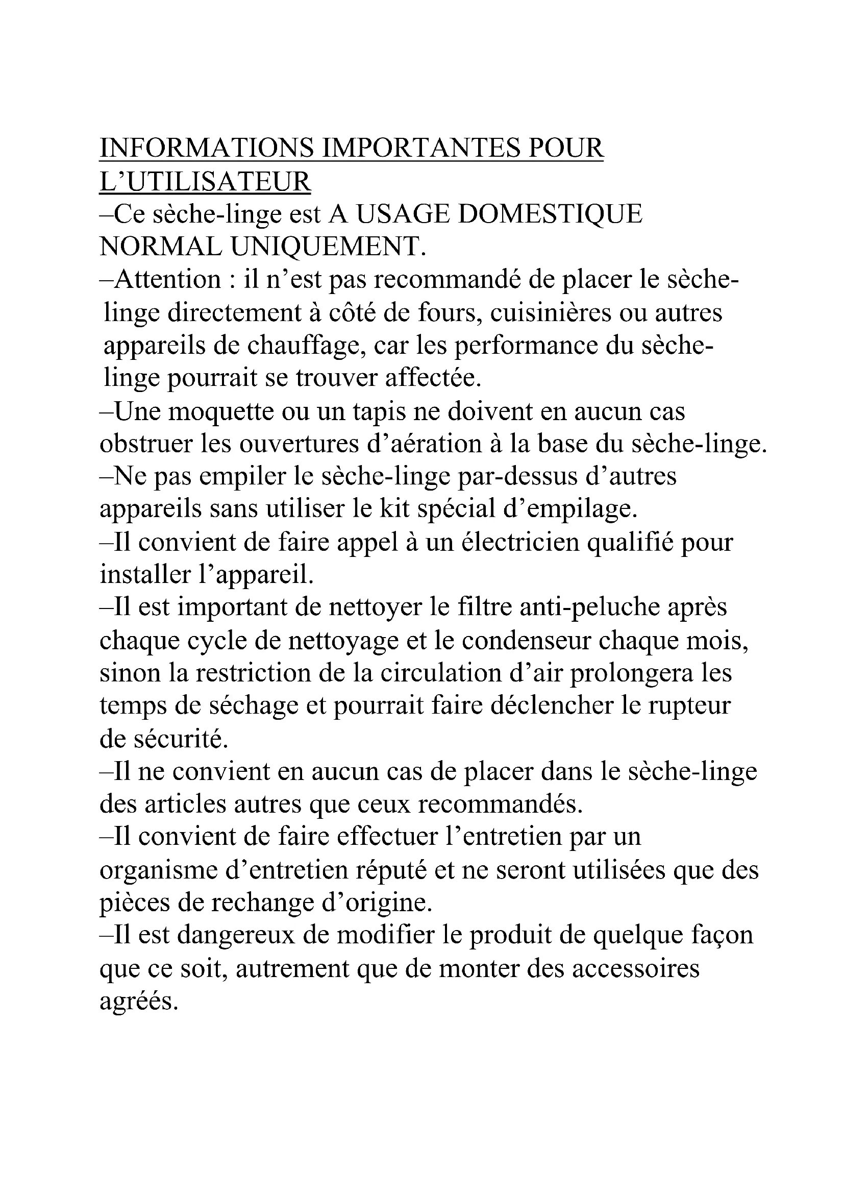 L’UTILISATEUR –Ce sèche-linge est A USAGE DOMESTIQUE NORMAL UNIQUEMENT. –Attention : il n’est pas recommandé de placer le sèche- linge directement à côté de fours, cuisinières ou autres appareils de chauffage, car les performance du sèche- linge pourrait se trouver affectée. –Une moquette ou un tapis ne doivent en aucun cas obstruer les ouvertures d’aération à la base du sèche-linge. –Ne pas empiler le sèche-linge par-dessus d’autres appareils sans utiliser le kit spécial d’empilage. –Il convient de faire appel à un électricien qualifié pour installer l’appareil. –Il est important de nettoyer le filtre anti-peluche après chaque cycle de nettoyage et le condenseur chaque mois, sinon la restriction de la circulation d’air prolongera les temps de séchage et pourrait faire déclencher le rupteur de sécurité. –Il ne convient en aucun cas de placer dans le sèche-linge des articles autres que ceux recommandés. –Il convient de faire effectuer l’entretien par un organisme d’entretien réputé et ne seront utilisées que des pièces de rechange d’origine. –Il est dangereux de modifier le produit de quelque façon que ce soit, autrement que de monter des accessoires agréés.–Nous conseillons de débrancher l’appareil après chaque utilisation. Pour de longues périodes de non utilisation (par ex. weekends, vacances ets.), l’appareil doit toujours être déconnecté de l’alimentation électrique. –L’arrière de l’appareil devient très chaud en cours d’utilisation. Positionnez le sèche-linge de façon que l’arrière ne soit pas accessible pendant son fonctionnement, mais assurez-vous que les côtés aient un dégagement suffisant pour permettre une bonne circulation d’air. –Le câble secteur et l’ensemble à prise spéciaux ne doivent être remplacés que par des articles d’origine provenant du fabricant ou de notre concessionnaire. Il est important de débarrasser les peluches de la fenêtre du sèche-linge et autour du joint de la porte après chaque cycle de séchage. Sinon, cela pourrait entraîner des fuites d’eau. Cet appareil peut être utilisé par les enfants à partir de 8 ans et plus et par les personnes ayant des capacités physiques, sensorielles ou mentales réduites ou manquant d'expérience et de connaissances si ces personnes sont supervisées ou ont reçu des instructions concernant l'utilisation de l'appareil en toute sécurité et si elles comprennent les risques induits. Les enfants ne doivent pas jouer avec l'appareil. Le nettoyage et l'entretien ne doivent pas être effectués par des enfants sans supervision.Les produits assouplissants ou produits similaires doivent être utilisés comme spécifié par les instructions accompagnant le produit assouplissant.