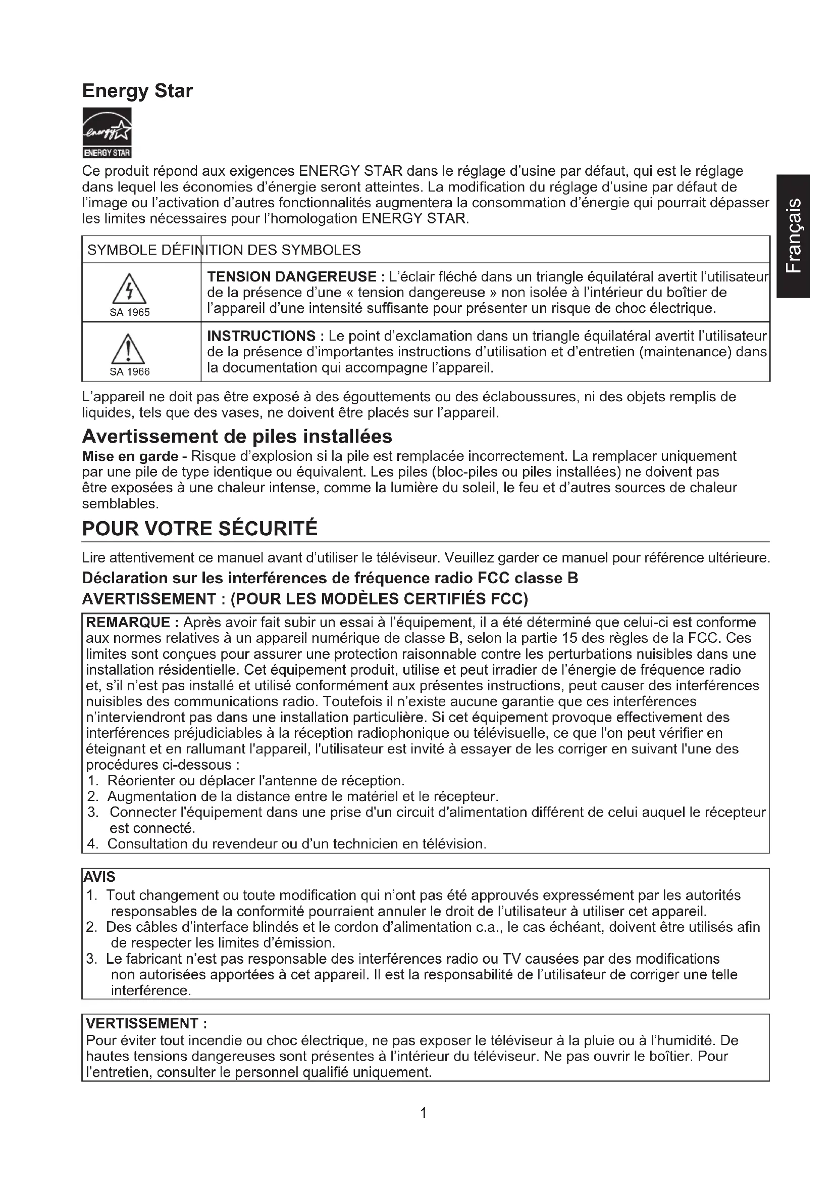 Lire attentivement ce manuel avant d’utiliser le téléviseur. Veuillez garder ce manuel pour référence ultérieure. Déclaration sur les interférences de fréquence radio FCC classe B