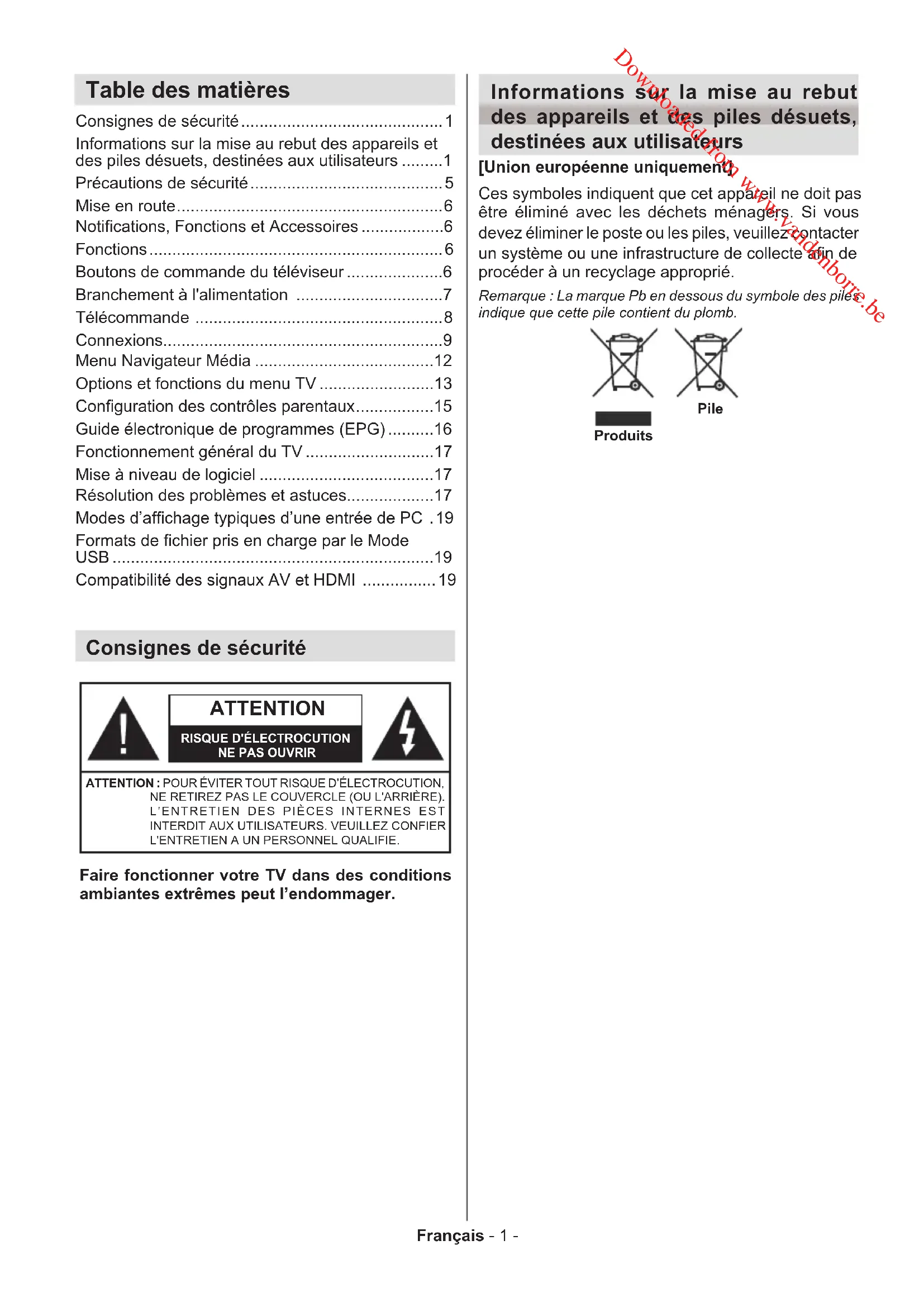 - Compatibilité des signaux AV et HDMI Informations sur la mise au rebut des appareils et des piles désuets, destinées aux utilisateurs [Union européenne uniquement] Ces symboles indiquent que cet appareil ne doit pas être éliminé avec les déchets ménagers. Si vous devez éliminer le poste ou les piles, veuillez contacter un système ou une infrastructure de collecte an de procéder à un recyclage approprié. Remarque : La marque Pb en dessous du symbole des piles indique que cette pile contient du plomb.Produits Pile Downloaded from www.vandenborre.beFrançais - 2 - Consignes de sécurité Alimentation secteur Ce téléviseur est conçu pour fonctionner à partir d’une alimentation en courant alternatif d’une tension de 220- 240 volts et d’une fréquence de 50 Hz. Une source d’alimentation différente pourrait l’endommager. Vérier que les caractéristiques (au dos du téléviseur) indiquent 220-240V AC avant de le brancher pour la première fois. Le fabricant décline TOUTE responsabilité en cas de dommage ou de panne provoqué par l’utilisation du produit avec la tension secteur erronée. Prise d’alimentation Nous avons équipé ce téléviseur d’une che secteur standard p. 19