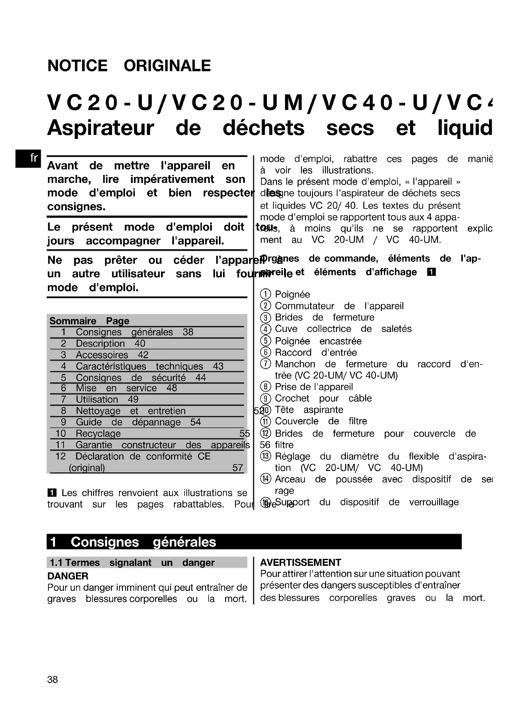 Printed: 08.07.2013 | Doc-Nr: PUB / 5071294 / 000 / 02NOTICE ORIGINALE VC20‑U/VC20‑UM/VC40‑U/VC40‑UM Aspirateur de déchets secs et liquides Avant de mettre l'appareil enmarche, lire impérativement sonmode d'emploi et bien respecter lesconsignes.Le présent mode d'emploi doit tou-jours accompagner l'appareil.Ne pas prêter ou céder l'appareil àun autre utilisateur sans lui fournir lemode d'emploi.Sommaire Page1 Consignes générales 382 Description 403 Accessoires 424 Caractéristiques techniques 435 Consignes de sécurité 446 Mise en service 487 Utilisation 498 Nettoyage et entretien 529 Guide de dépannage 5410 Recyclage 5511 Garantie constructeur des appareils 5612 Déclaration de conformité CE(original) 57 1 Les chiffres renvoient aux illustrations se trouvant sur les pages rabattables. Pour lire lemode d'emploi, rabattre ces pages de manièreà voir les illustrations. Dans le présent mode d'emploi, « l'appareil » désigne toujours l'aspirateur de déchets secs et liquides VC 20/ 40. Les textes du présent mode d'emploi se rapportent tous aux 4 appa- reils, à moins qu'ils ne se rapportent explicite-ment au VC 20‑UM / VC 40‑UM.Organes de commande, éléments de l'ap-pareil et éléments d'affichage 1 Poignée Commutateur de l'appareil Brides de fermeture Cuve collectrice de saletés Poignée encastrée Raccord d'entrée Manchon de fermeture du raccord d'en- trée(VC20‑UM/VC40‑UM)