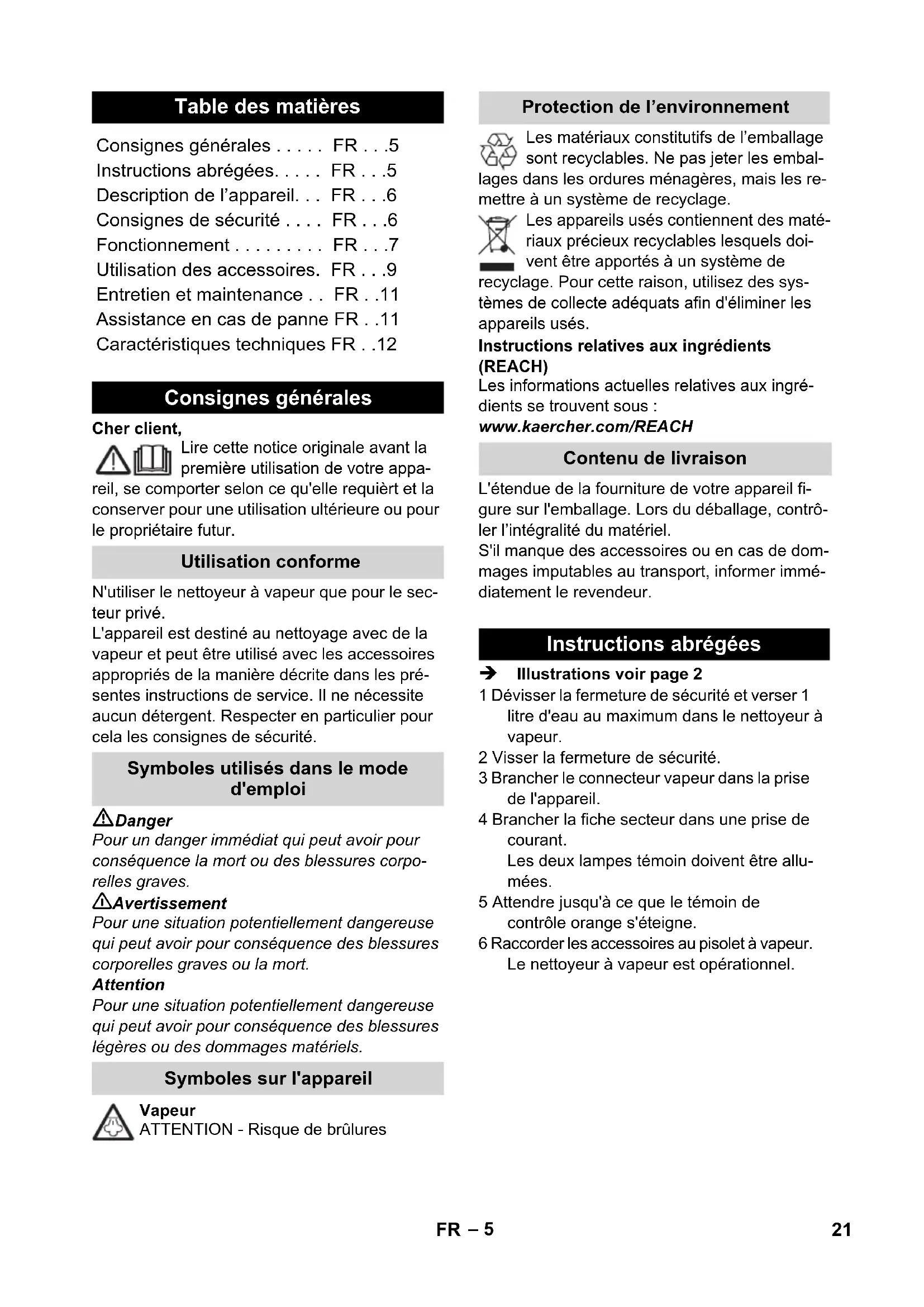 - Protection class IP X4 Protective class I Performance data Heating output 1500 W Heating output steam iron 750 W Operating pressure max. 0,32 MPa Heating time 8 Minutes Max. steam quantity 40 g/min Dimensions Boiler capacity 1,0 l Length 380 mm Width 254 mm Height 260 mm Weight (without accessories) 2,9 kg 20 EN– 5 Cher client, Lire cette notice originale avant la première utilisation de votre appa- reil, se comporter selon ce qu'elle requièrt et la conserver pour une utilisation ultérieure ou pour le propriétaire futur. N'utiliser le nettoyeur à vapeur que pour le sec- teur privé. L'appareil est destiné au nettoyage avec de la vapeur et peut être utilisé avec les accessoires appropriés de la manière décrite dans les pré- sentes instructions de service. Il ne nécessite aucun détergent. Respecter en particulier pour cela les consignes de sécurité. Danger Pour un danger immédiat qui peut avoir pour conséquence la mort ou des blessures corpo- relles graves. 몇 Avertissement Pour une situation potentiellement dangereuse qui peut avoir pour conséquence des blessures corporelles graves ou la mort. Attention Pour une situation potentiellement dangereuse qui peut avoir pour conséquence des blessures légères ou des dommages matériels. Vapeur ATTENTION - Risque de brûlures Les matériaux constitutifs de l’emballage sont recyclables. Ne pas jeter les embal- lages dans les ordures ménagères, mais les re- mettre à un système de recyclage. Les appareils usés contiennent des maté- riaux précieux recyclables lesquels doi- vent être apportés à un système de recyclage. Pour cette raison, utilisez des sys- tèmes de collecte adéquats afin d'éliminer les appareils usés. Instructions relatives aux ingrédients (REACH) Les informations actuelles relatives aux ingré- dients se trouvent sous : www.kaercher.com/REACH L'étendue de la fourniture de votre appareil fi- gure sur l'emballage. Lors du déballage, contrô- ler l’intégralité du matériel. S'il manque des accessoires ou en cas de dom- mages imputables au transport, informer immé- diatement le revendeur. Illustrations voir page 2 1 Dévisser la fermeture de sécurité et verser 1 litre d'eau au maximum dans le nettoyeur à vapeur. 2 Visser la fermeture de sécurité. 3 Brancher le connecteur vapeur dans la prise de l'appareil. 4 Brancher la fiche secteur dans une prise de courant. Les deux lampes témoin doivent être allu- mées. 5 Attendre jusqu'à ce que le témoin de contrôle orange s'éteigne. 6 Raccorder les accessoires au pisolet à vapeur. Le nettoyeur à vapeur est opérationnel. Table des matières Consignes générales