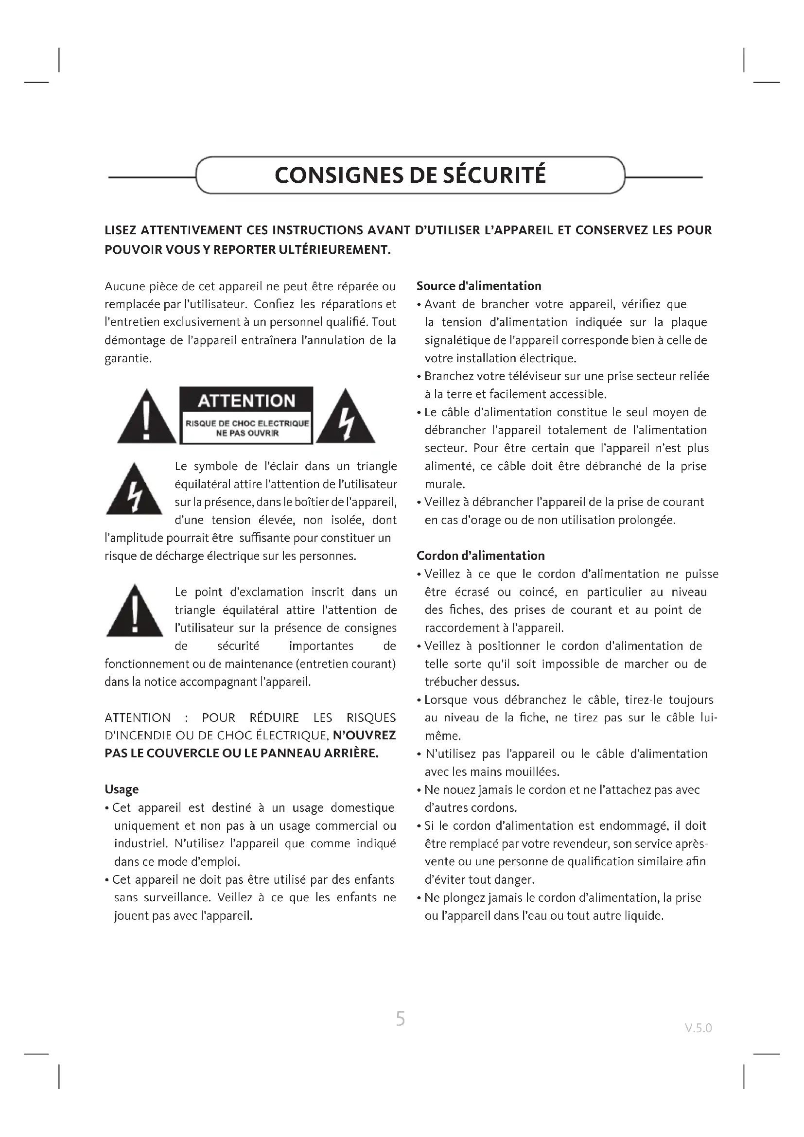 V.5.0 LISEZ ATTENTIVEMENT CES INSTRUCTIONS AVANT D’UTILISER L’APPAREIL ET CONSERVEZ LES POUR POUVOIR VOUS Y REPORTER ULTÉRIEUREMENT. Aucune pièce de cet appareil ne peut être réparée ou remplacée par l’utilisateur. Conez les réparations et l’entretien exclusivement à un personnel qualié. Tout démontage de l’appareil entraînera l’annulation de la garantie. Le symbole de l’éclair dans un triangle équilatéral attire l’attention de l’utilisateur sur la présence, dans le boîtier de l’appareil, d’une tension élevée, non isolée, dont l’amplitude pourrait être susante pour constituer un risque de décharge électrique sur les personnes. Le point d’exclamation inscrit dans un triangle équilatéral attire l’attention de l’utilisateur sur la présence de consignes de sécurité importantes de fonctionnement ou de maintenance (entretien courant) dans la notice accompagnant l’appareil.